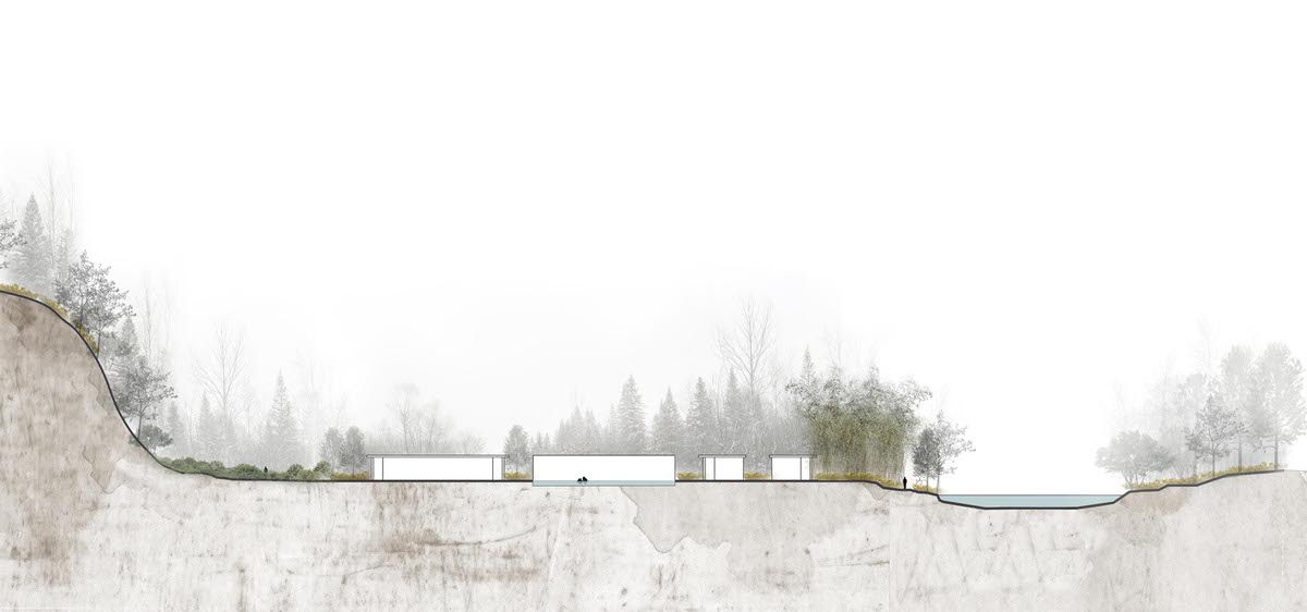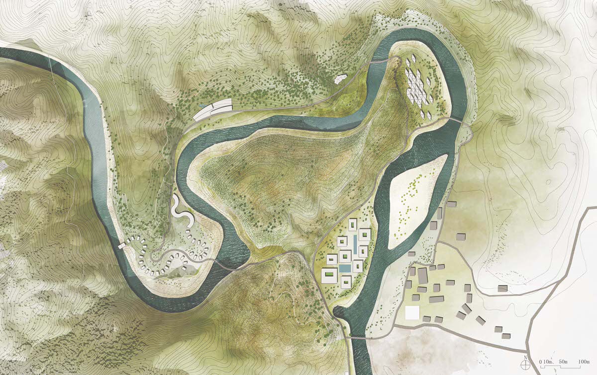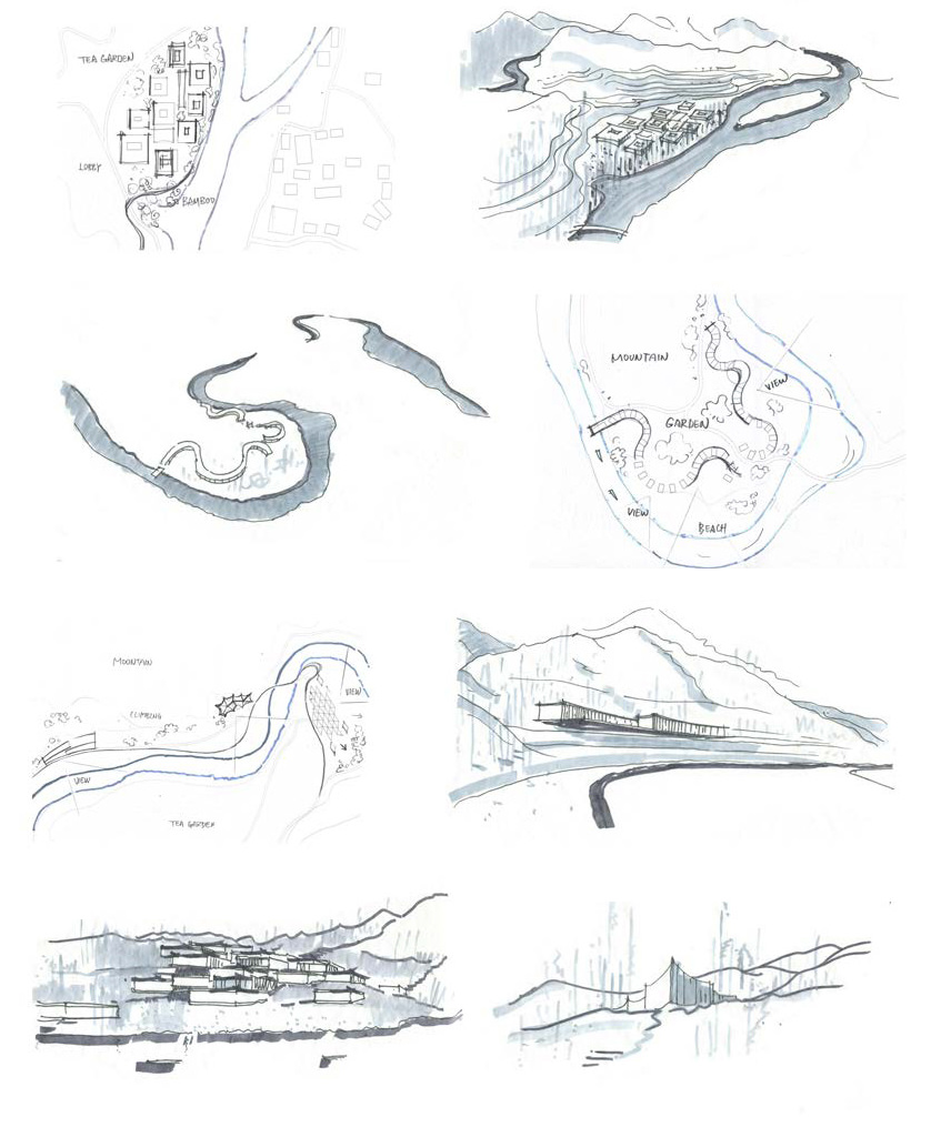 The site located within the beautiful Wuyi Mountain area is surrounded by hills, brooks and tea plantations, owning perfect environment for quietness, nature and elegance pursued by CHEDI. On this site of 100 hectares, the client planned to build up a boutique holiday hotel with 120 guestrooms. The design attempted to divide hotel functions into compounds, in between the original topography would be kept. Starting from analyses on topography, sunshine, wind and landscape view, the design chose suitable areas along brooks and river valley for construction, distributing hotel functions accordingly. The terraced tea plantation in the middle of the site was left without any change. This deliberate ‘blank’ will be enjoyed as a landscape background by all compounds.