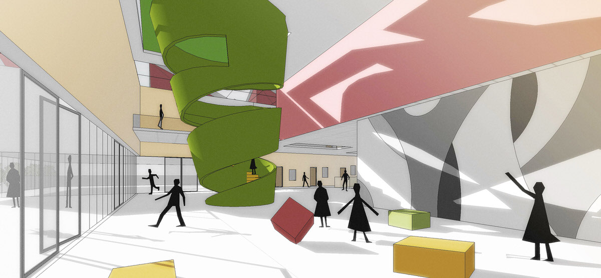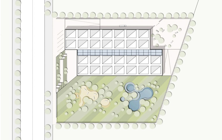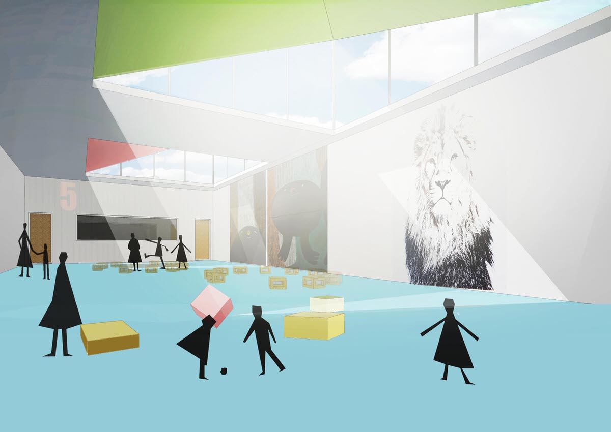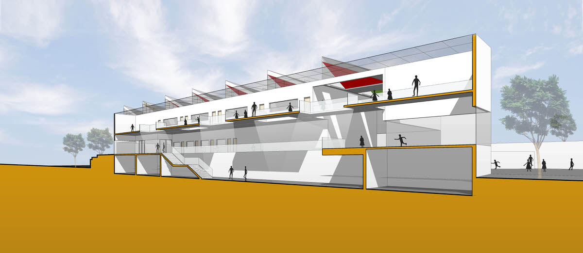 The whole building complex was arranged on norther side while the southern part was largely kept for playground. The access was put on western side along the street. Elevated access is a transitional area between children’s and adults’ worlds. The access steps along the street guarantee children’s security, adding a touch of ceremony at the same time.