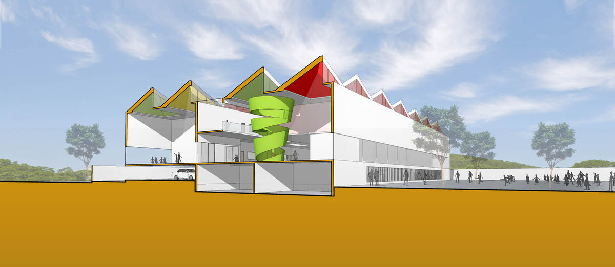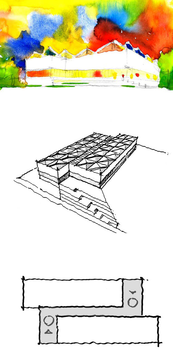 Because of the poor geographical conditions on site, the basement would cost a lot of budget. The scheme therefore chose a regular grid structure, limiting the pile number within a very economic scale. Compact building complex reduces the exterior wall area to a minimum and a compact floor plan makes a simple and efficient traffic routes possible. At the same time, the interior depth was enlarged, compensated with skylights and courtyards for natural light, through which a simple form resulted by limited budget becomes vivid and interesting. The introduction of natural light ensures a lively indoor space.