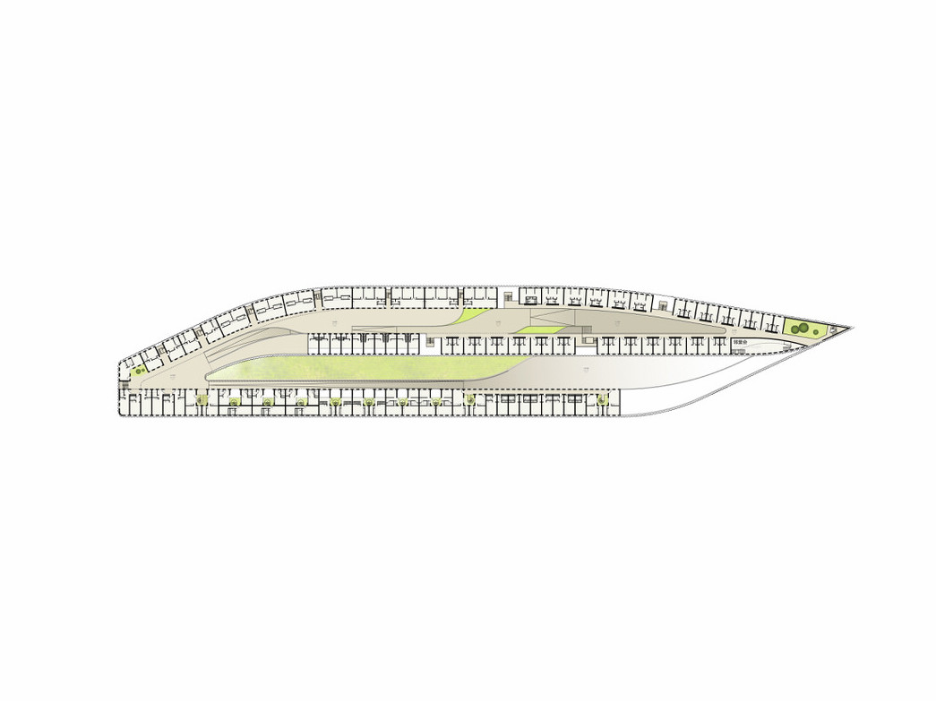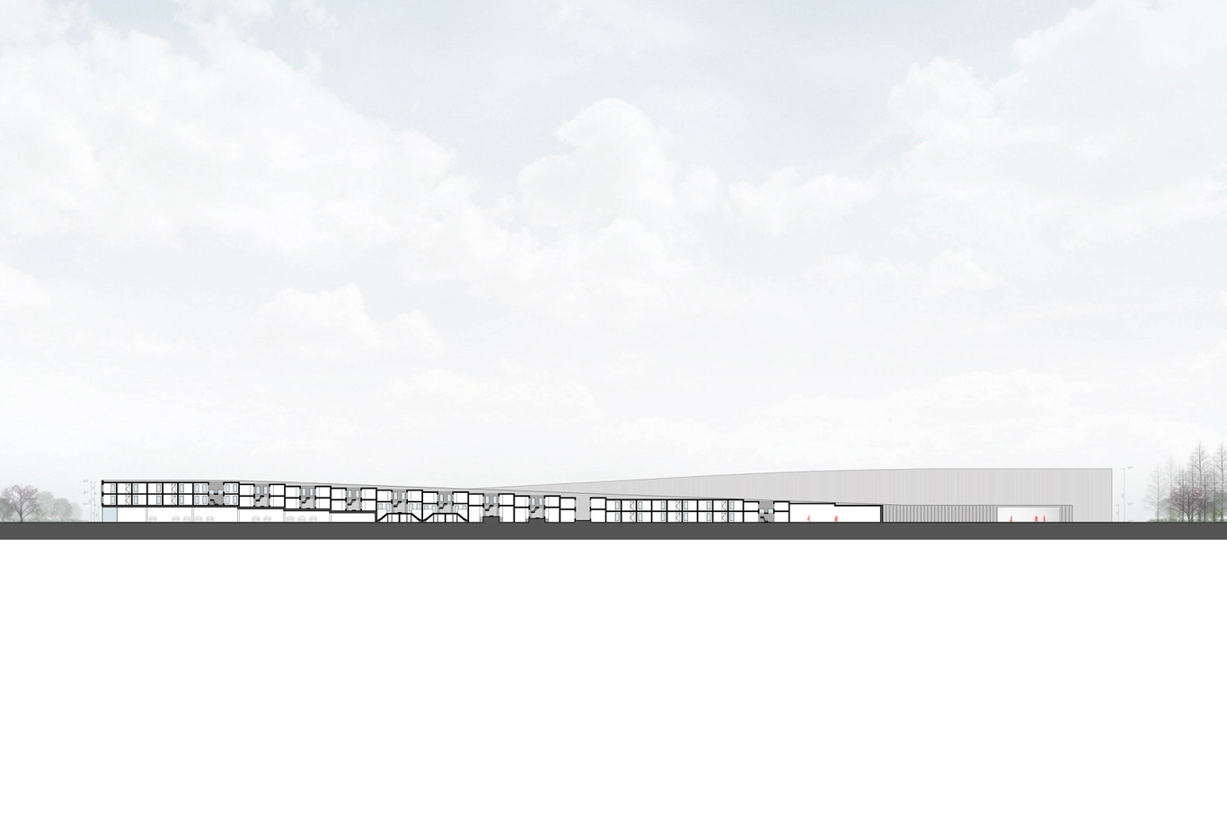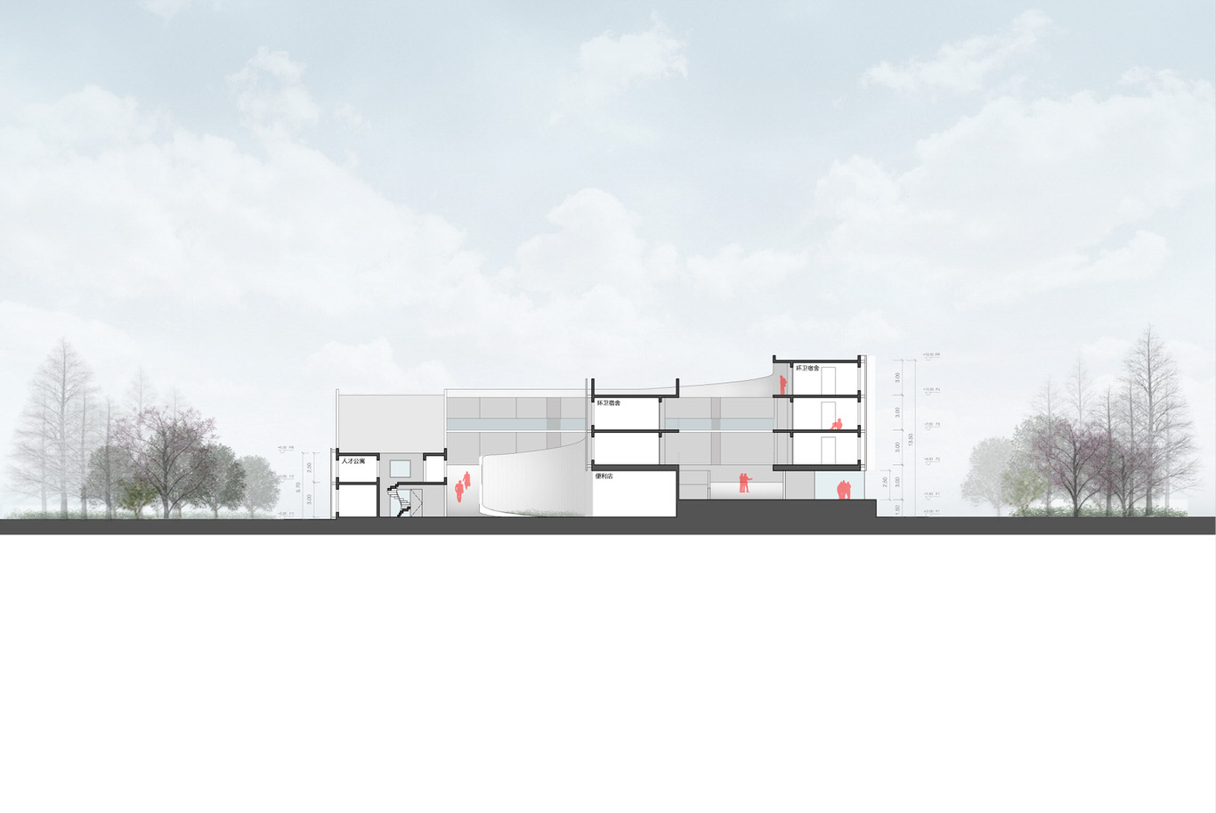 The layout borrowed the module of panel flat which was popular in the last century, arranging three rows of apartment buildings which meet the requirements on comprehensive spacing and land use rate. Corresponding with the site boundaries, the flat rows have a curvilinear outline and indoor flowing routes. Continuously rising skylines superimpose over one another, emphasizing the visual effect of the curvilinear form. Finally, the economical and practical panel flats become an impressive and unique work despite of site limits.
