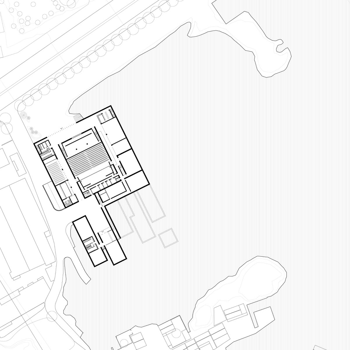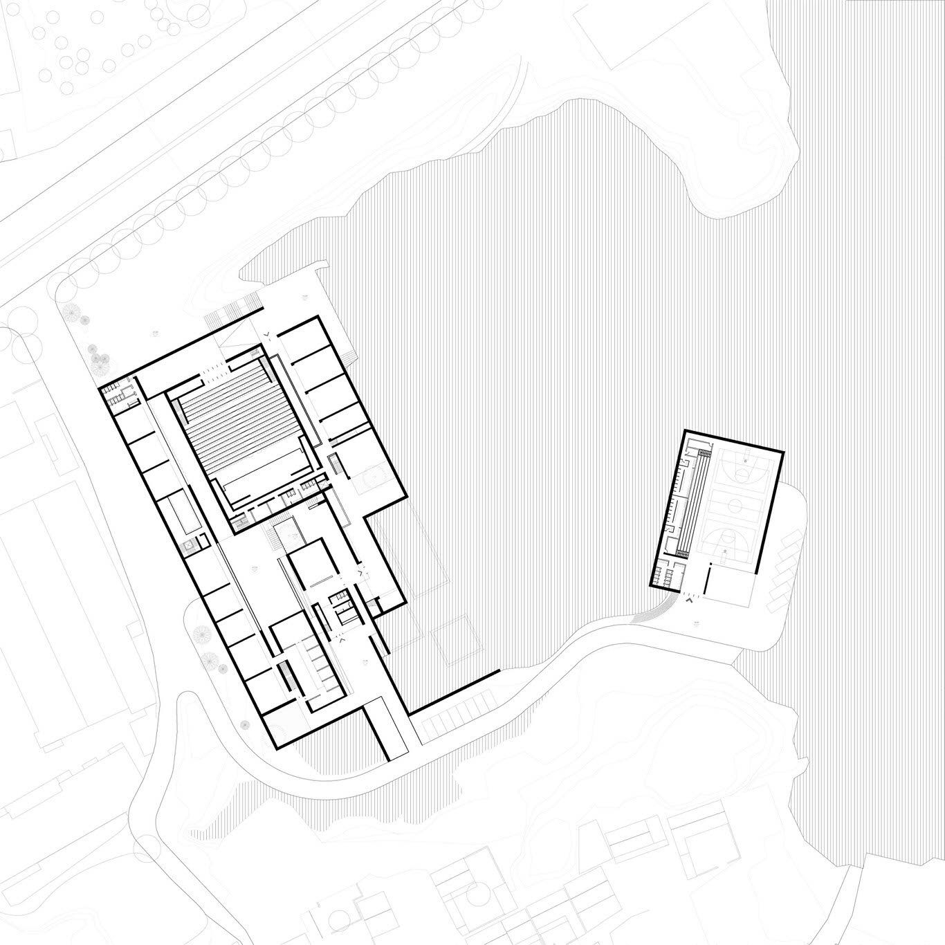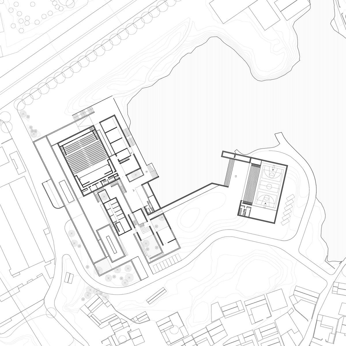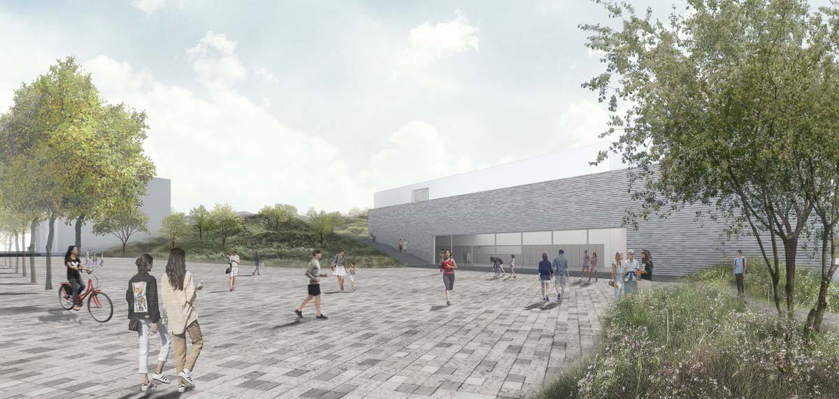 The buildings blend into the terracing of the site, creating an open and all-inclusive cultural and sports center, while the landscape of the park is retained and enhanced with the new layout of paths and additional planting. Altogether, this generates a new balanced eco-system that interacts with and forms a dialogue with the buildings.