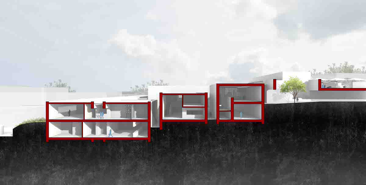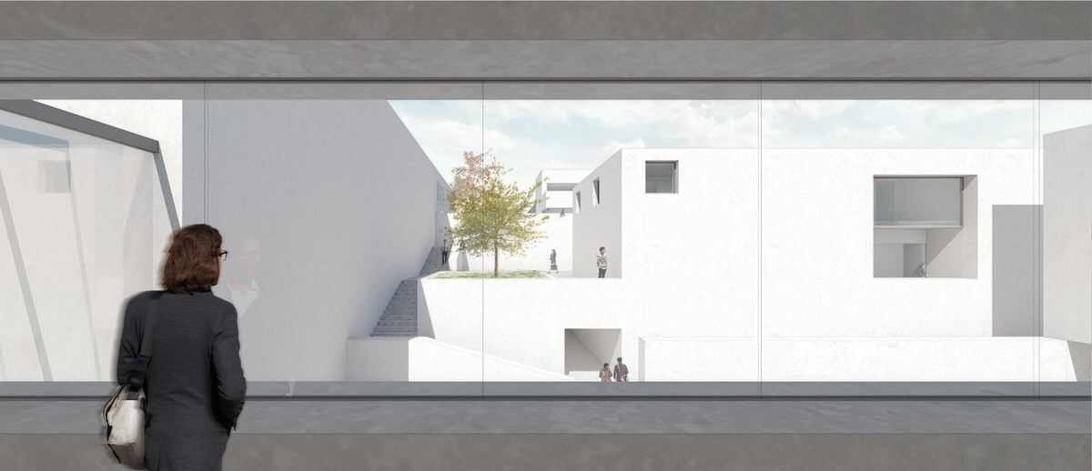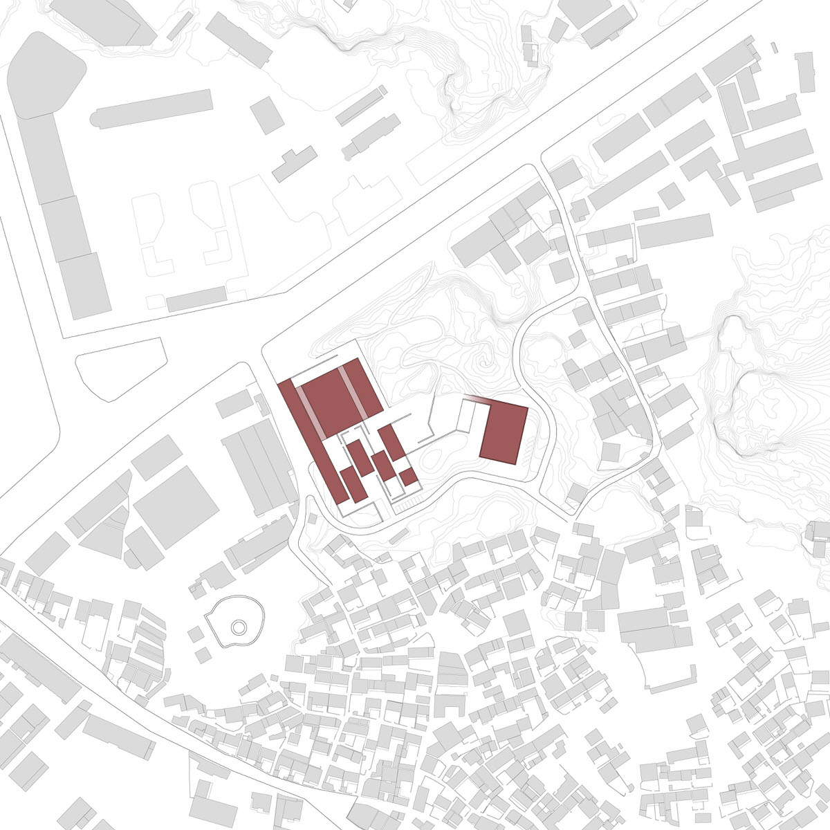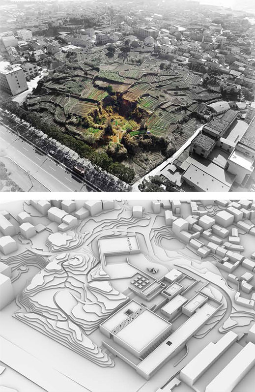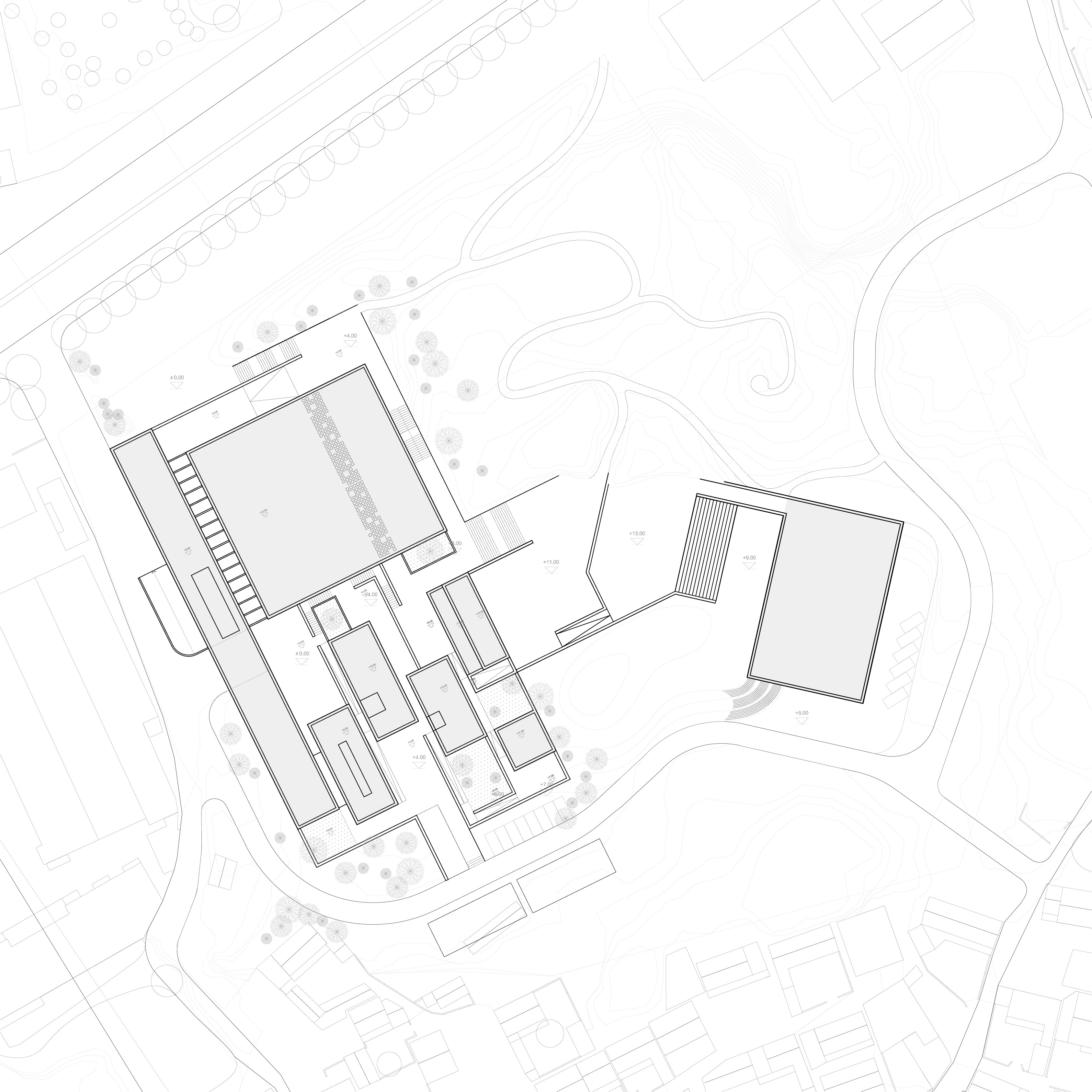 The Client would like to maintain and accentuate the natural landscape of the site. As such, the key objective of the proposal is to create a public town park, with the buildings being arranged more densely towards the southwest side. The massing is divided into differently sized blocks according to the various internal uses. These blocks orient to the terraced topography of the site with platforms and ramps, which are not only used as pedestrian access, but also form a stimulating sequence of public outdoor spaces.