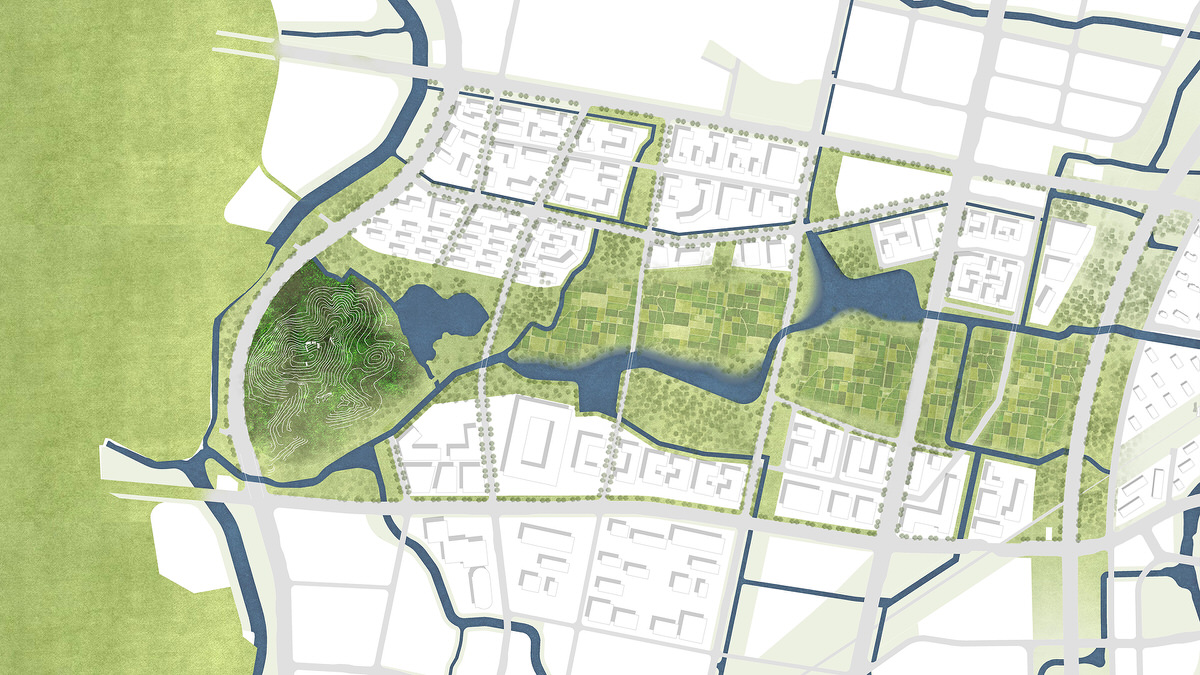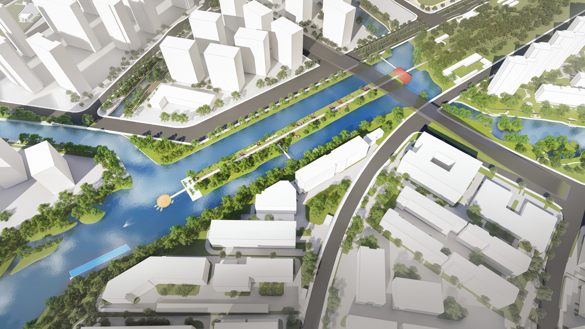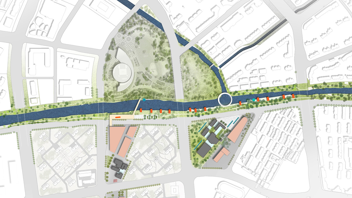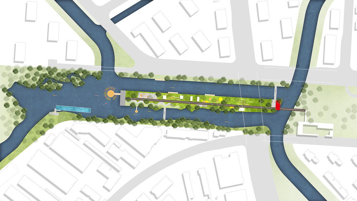 The design of the transitional suburban area of the river is mainly aimed at connecting the existing water systems, and creating an active waterfront public space. It achieves that by expanding the original watercourse and repurpose an abandoned freight railway track, currently segregating the areas, turning it into a railway heritage park.