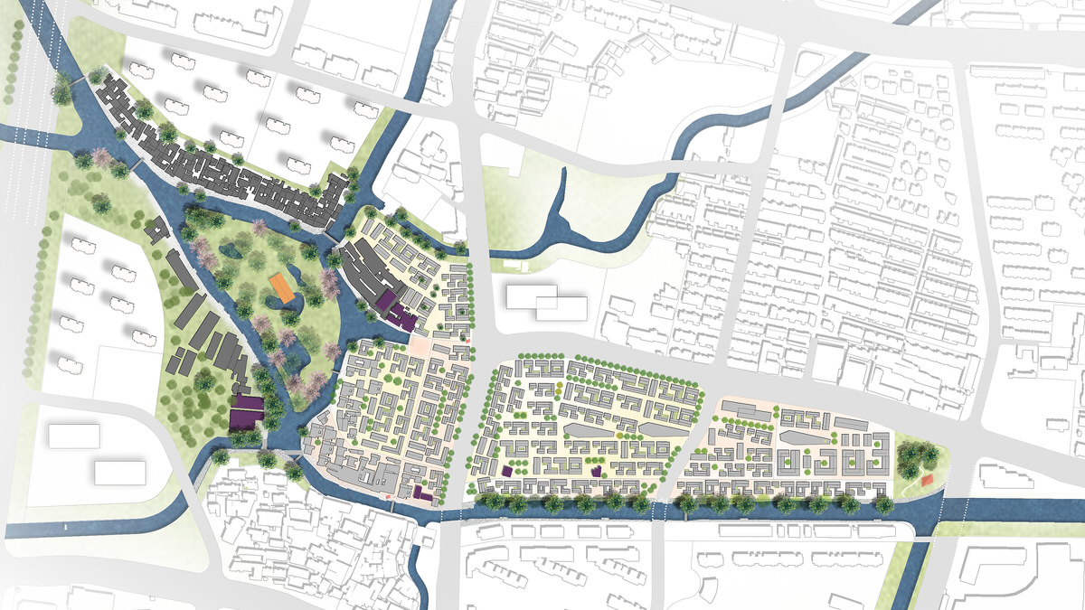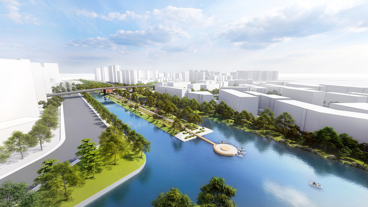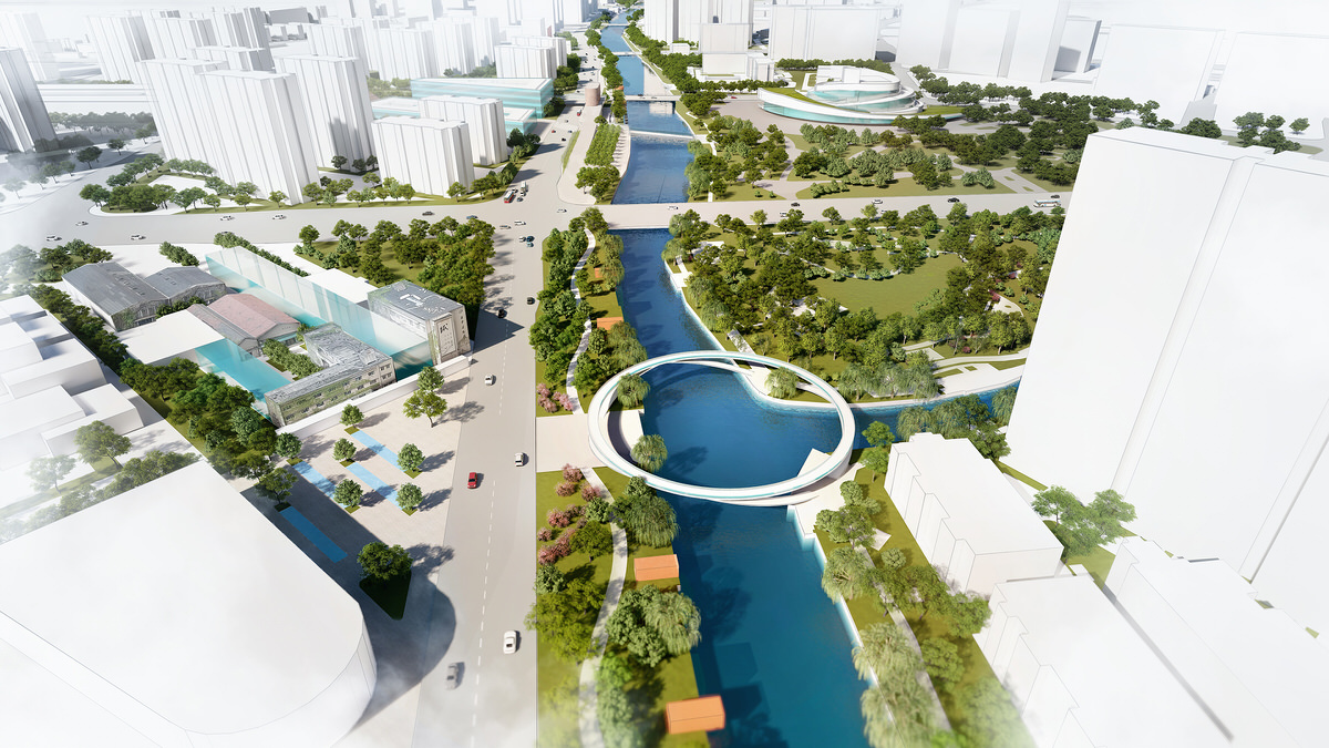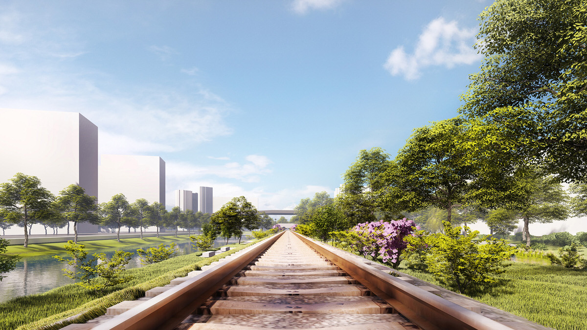 The design of the transitional suburban area of the river is mainly aimed at connecting the existing water systems, and creating an active waterfront public space. It achieves that by expanding the original watercourse and repurpose an abandoned freight railway track, currently segregating the areas, turning it into a railway heritage park.