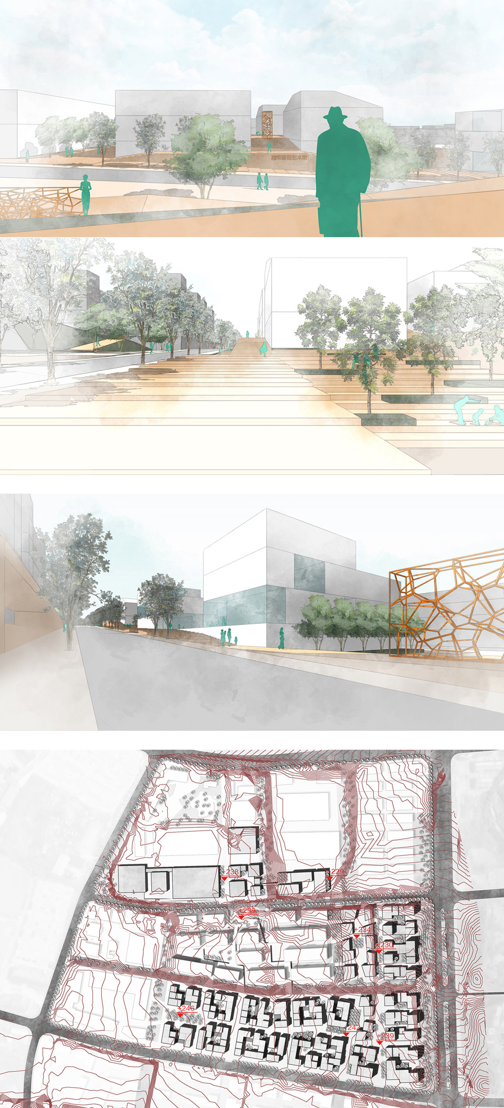 The main purpose of the scheme is to enhance the openness of the whole area, so that the existing plants and the new plants can be combined into an integrated urban area. At the same time, the scheme is designed to add new supporting public service features. The hilly wasteland unsuitable for construction is transformed into urban public park to stimulate the surrounding outdoor life. With the celadon industry as a common theme, the scheme integrates the stand-alone vendors and isolated factory productions, and turns them into a vibrant community enriched by exhibitions, cultural events and urban life. For these purposes, the architects persuaded manufacturers to open their walls and arrange their product showrooms on both sides of the road. The road is then expanded allowing more space for pedestrians, transforming the area into a pedestrian block with brand showrooms and museums. Taking advantage of the large number of outdoor terraces and stairs, harmonising them with the overpass and slope park, the elevation difference can be transformed into a public space landscape with the distinctive local features. Moreover, the individual industrial units producing different consumer goods are connected by the leisurious outdoor atmosphere to enhance people's communication.