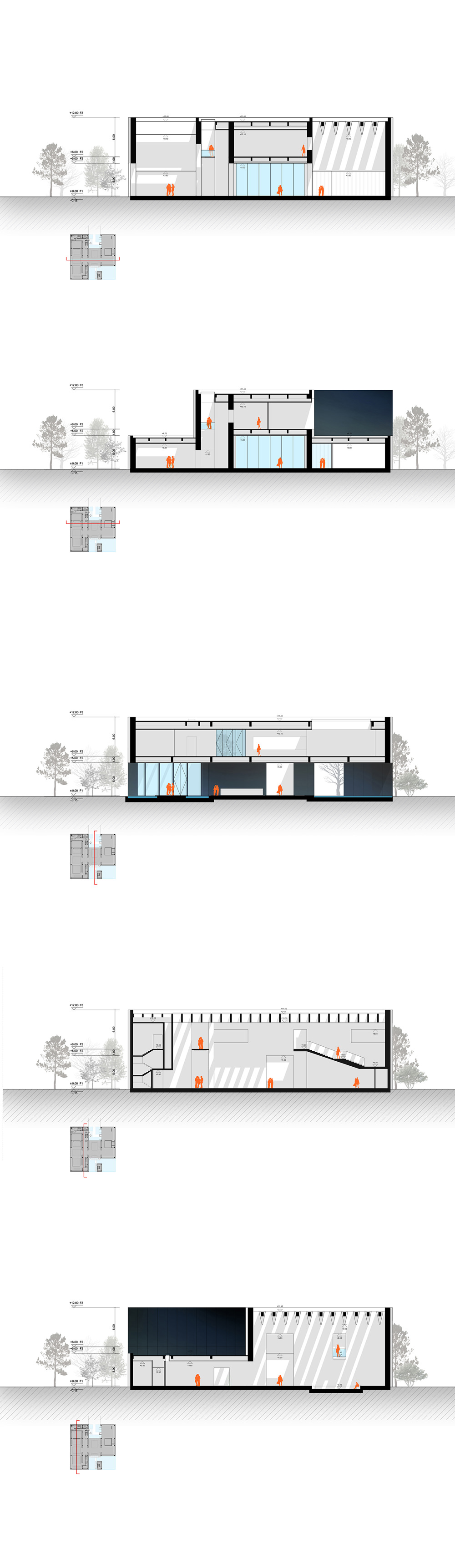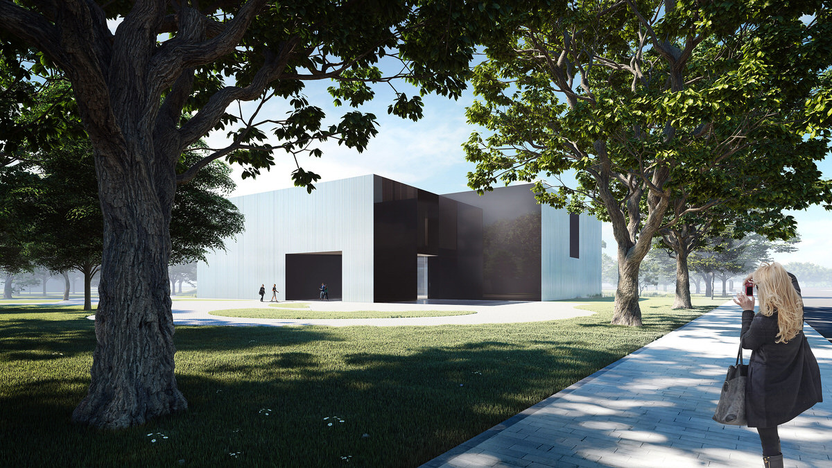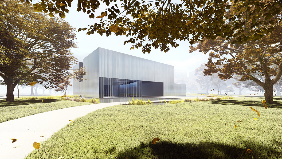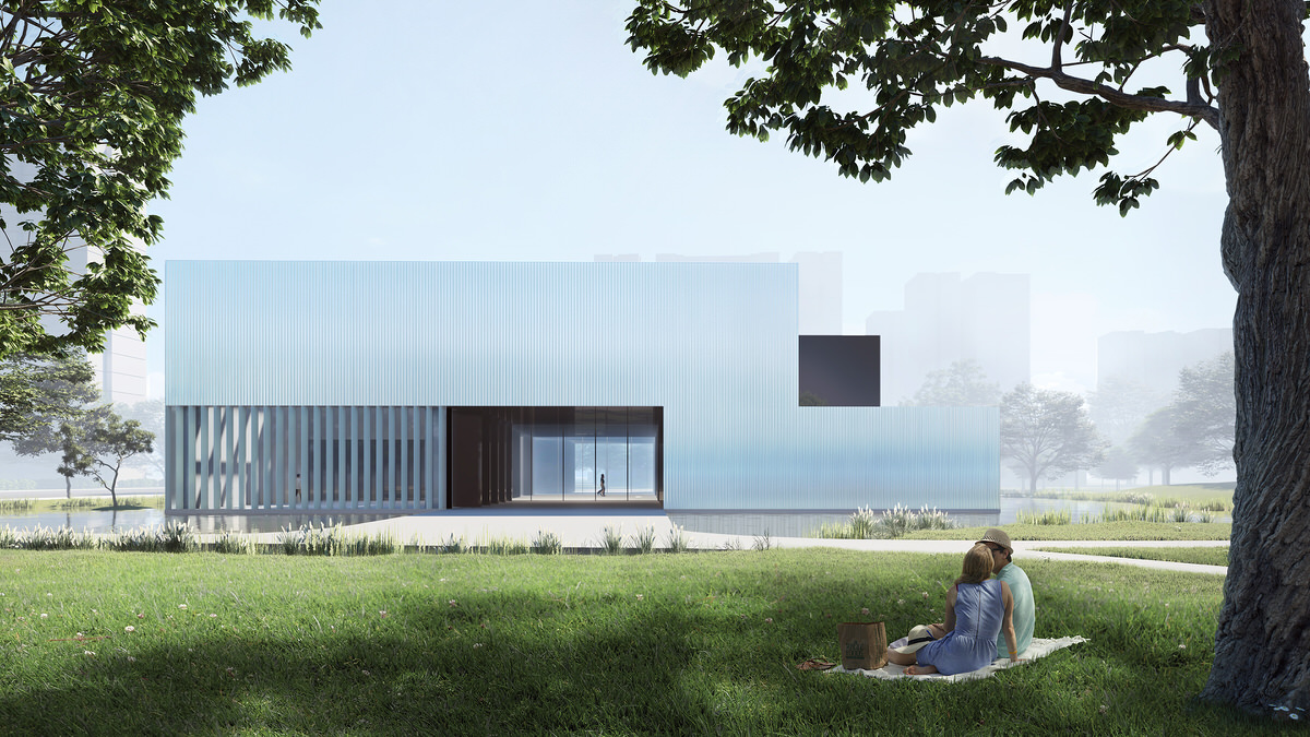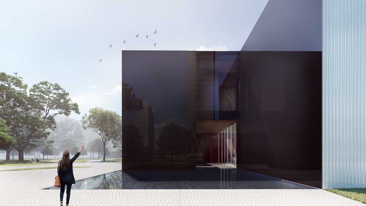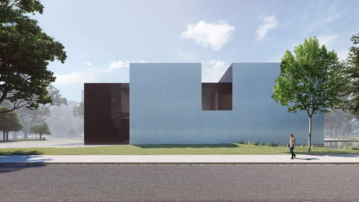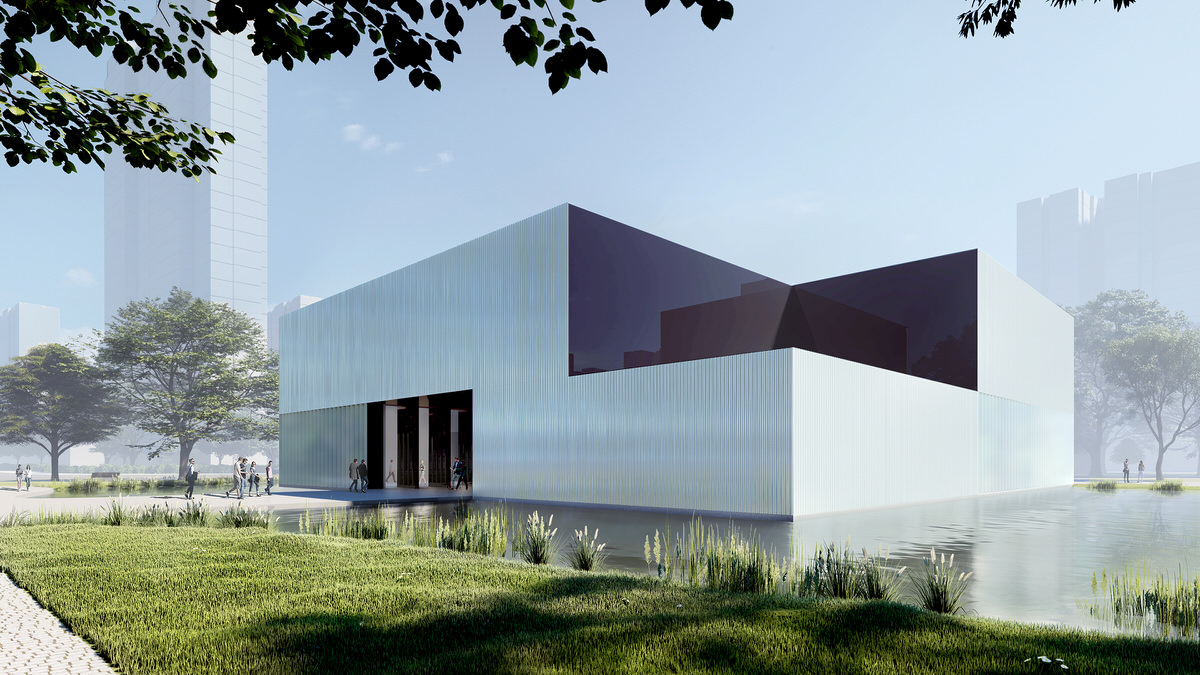 A "Silver Cube" wrapped in anodized aluminum plates will be placed intrusively by the pond in the park. The cube will be cut in different directions according to the interior requirements. In sharp contrast with the silver exterior walls, the facade of the cuts will be made of dark colored glazed glass, which unfolds the internal space and projects it onto the surface of the building, prompting the visitors to explore its internal space from outside. The architecture will stand in the green park space in its abstract form and neutral posture to weaken its identity, and provide a container for activities, a container that can adapt to the passage of time and the change of its functions.