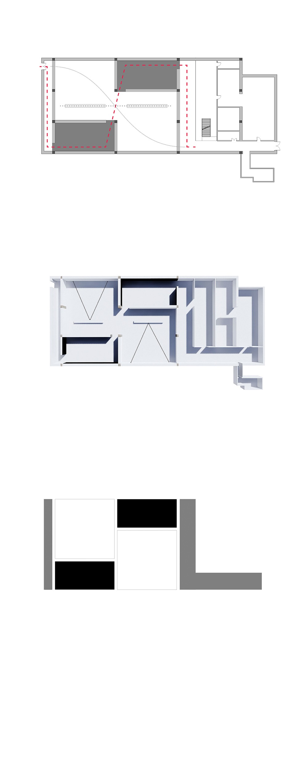 Each segmented space is perfectly rectangular. Through the arrangement of the Rooms with different size and access, a feeling of the flowing space is created. The colours of the exhibition spaces shuffle between black and white throughout the journey, once again enhancing the feeling of moving through the spatial sequence, whilst indicating the distinctness of each section of the exhibition.