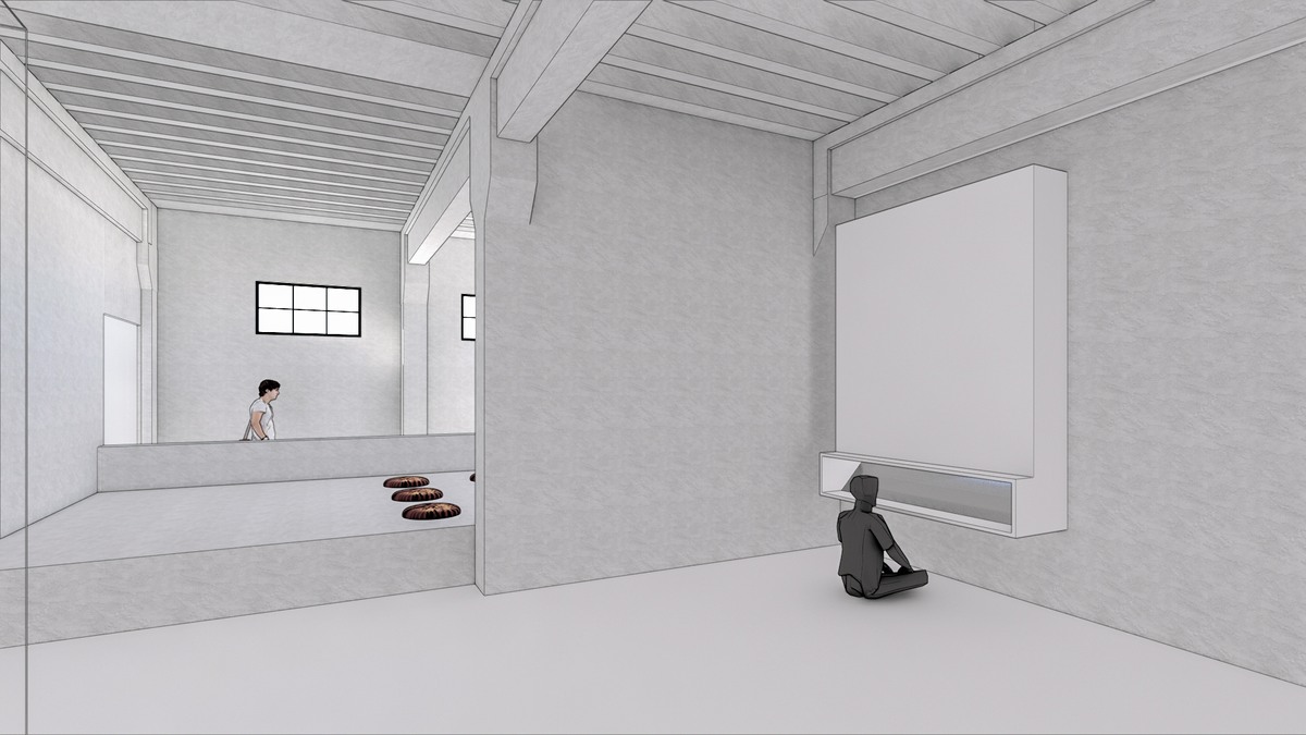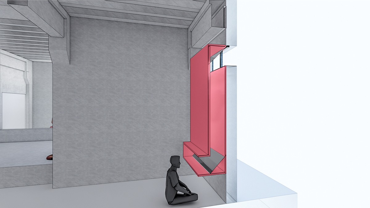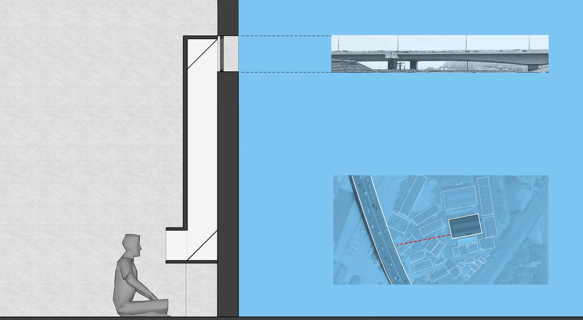 This is an installation art piece, at the same time, it can be used for meditation or to host small discussions as a multifunctional private space. The art piece consists of several segments: A raised platform area for group meditation and presentation; a meditation space denoted by light and shadow; a viewing platform where a periscope reflects the restless elevated urban expressway.