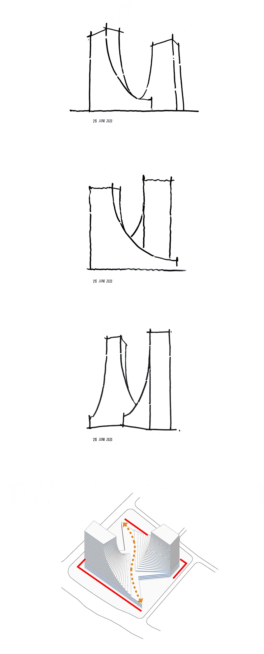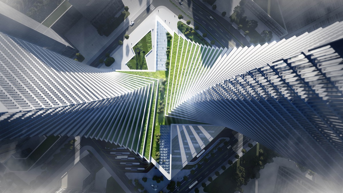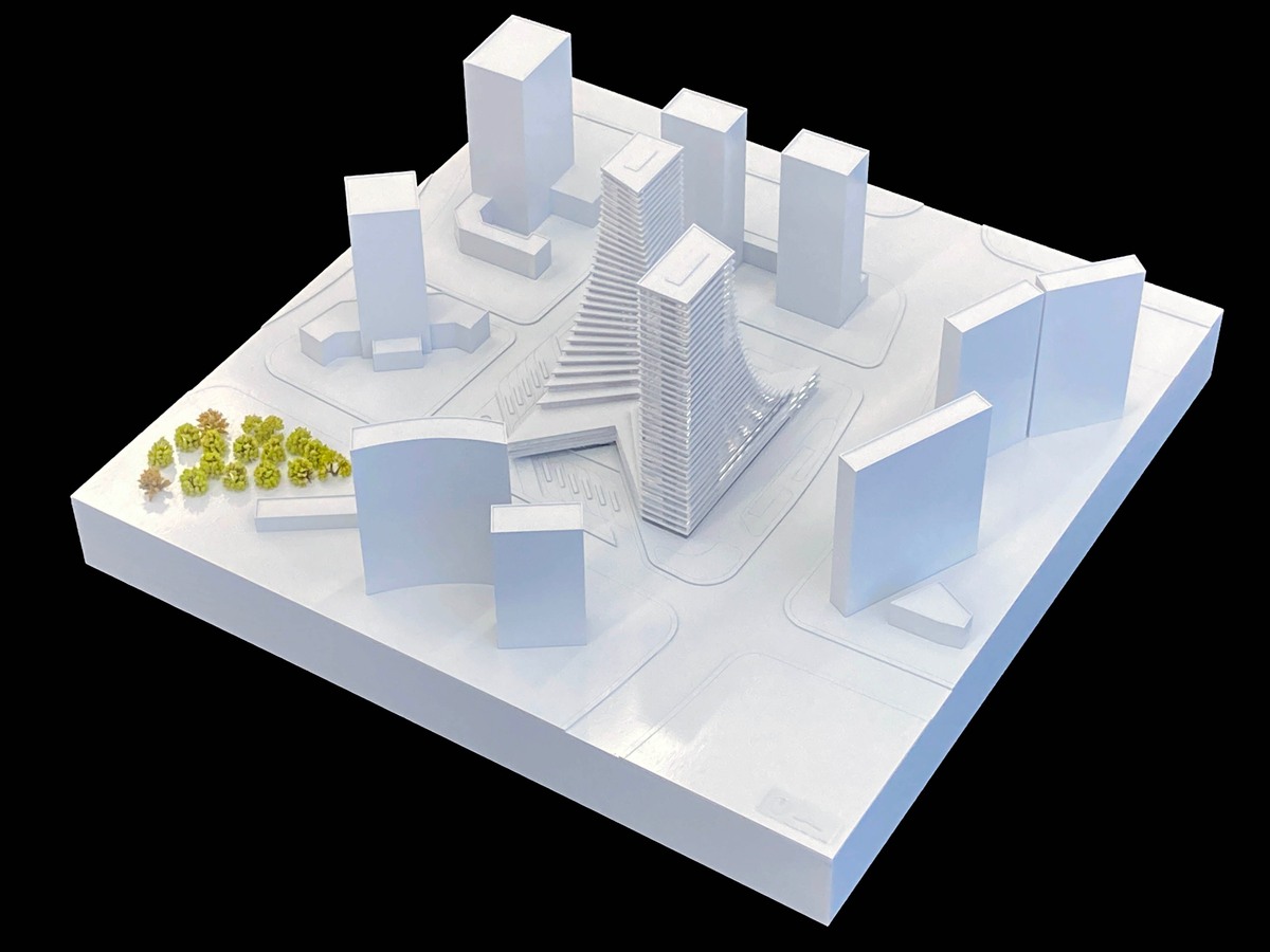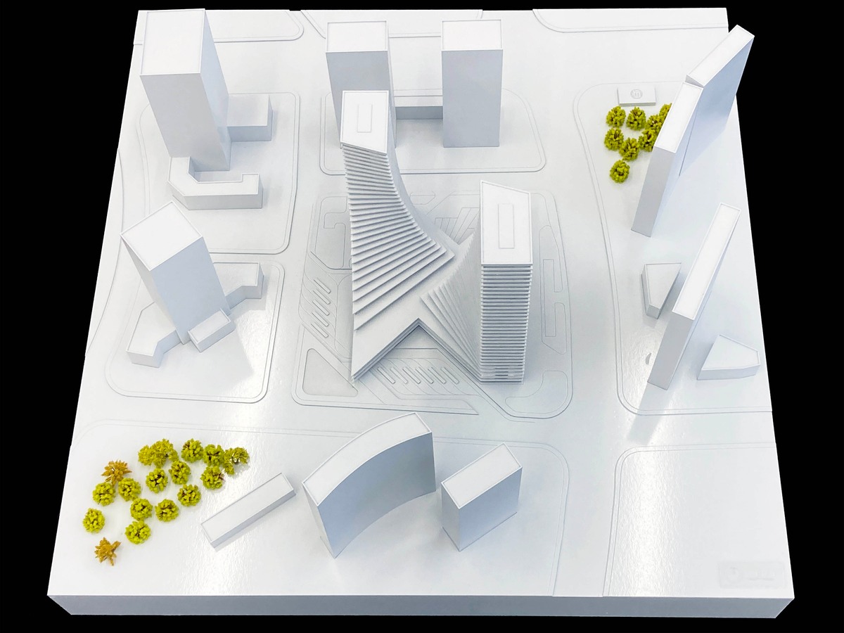 Based on the technical analysis of the road system and traffic technology, the optimal placement of the bus terminal should be at the west side of the site. Currently, the subway station is located on the east side. Naturally, a commercial street is manifested along the flow of commuting passengers that travel diagonally across the site. Positioned on the north and south corners are the two high-rises. The outer edges of the building are parallel to the road, distinctly forming the urban interface. The spiralling of the towers amalgamates the 45 degree intersection between the urban interface and the diagonal commercial street, sculpting the iconic Transport Centre Complex.