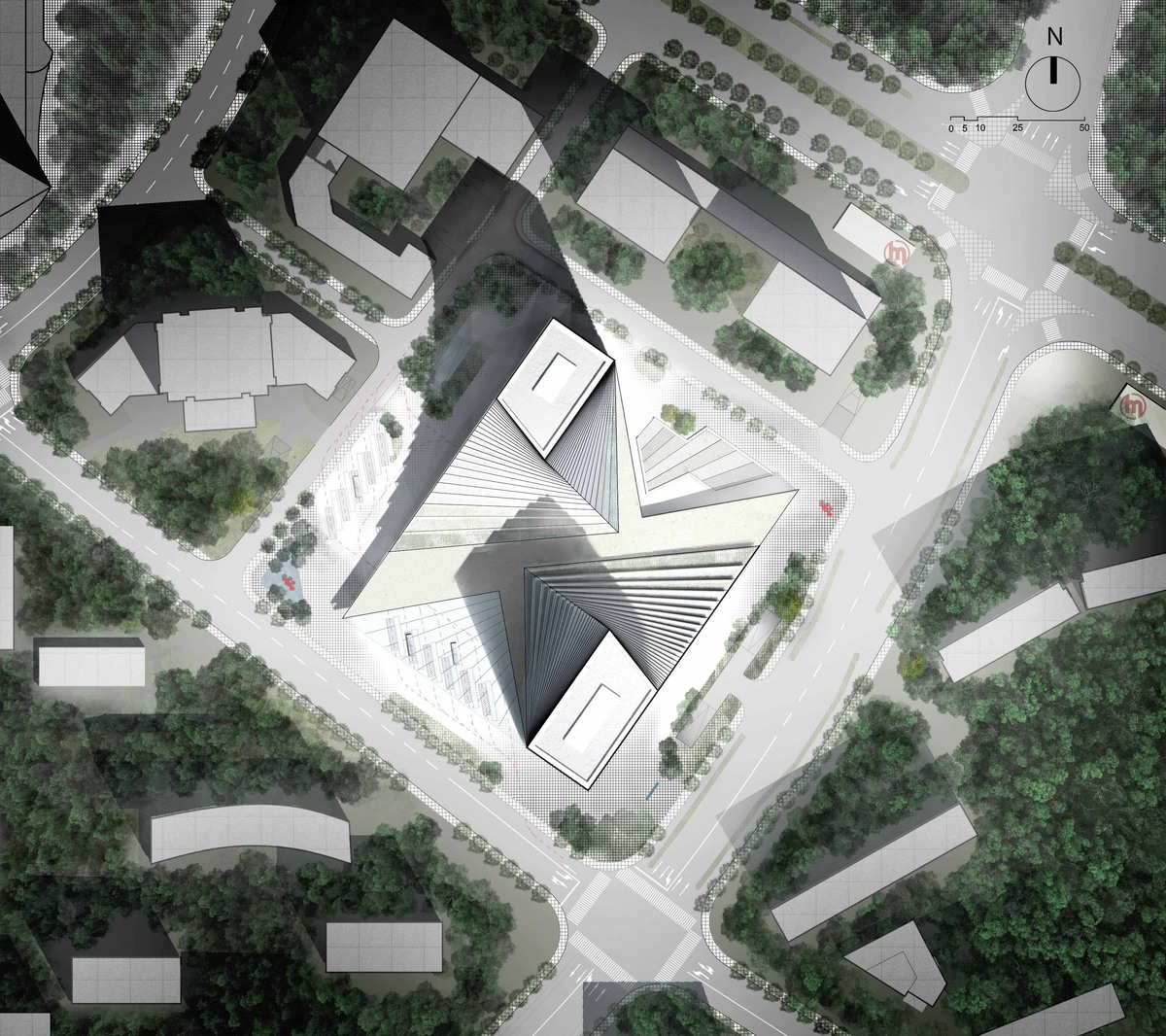The Transport Centre Complex is made up of two parts, the bus terminals and surrounding commercial areas on the ground level, and the two high-rises building for hotel and office. The goal of the plan is to channel the commuting traffic that transfers between bus and subway, to create a vibrant and welcoming local hub.