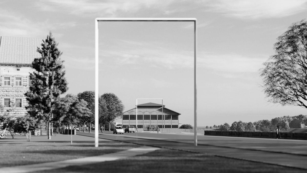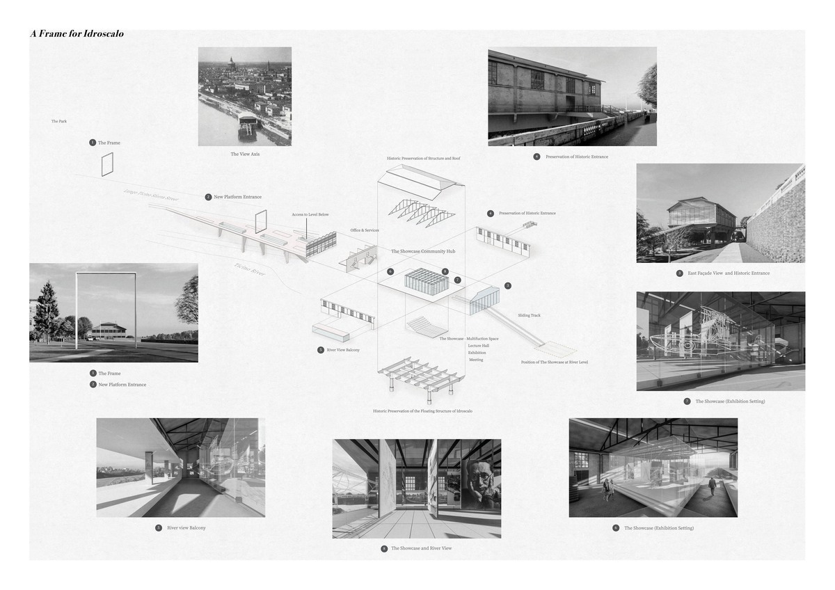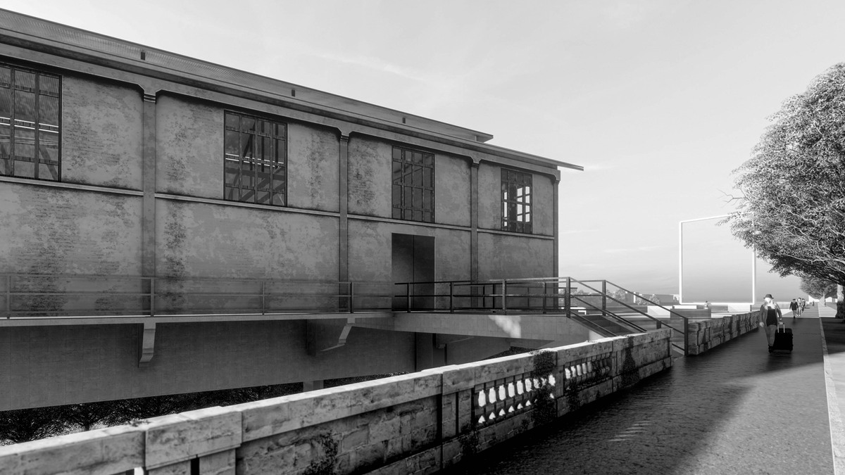 The Frame (exterior) :Idroscalo community hub is designed to connect the city with a path from an entrance in its west façade. Looking from the city, a large frame displays the historic building, while from the building we see the city, the spire of the cathedral, and the mountains through this frame. Along this axis, the plan redefines a significant connection to the city and extends this sight corridor along Lungo Ticino Sforza. Also, the entrance platform strengthens the connection between Idroscale and the city.