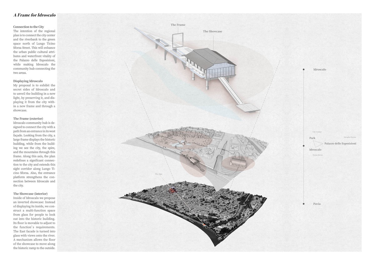 Displaying Idroscalo:The proposal is to exhibit the secret sides of Idroscalo and to unveil the building in a new light, by preserving it, and displaying it from the city within a new frame and through a showcase.