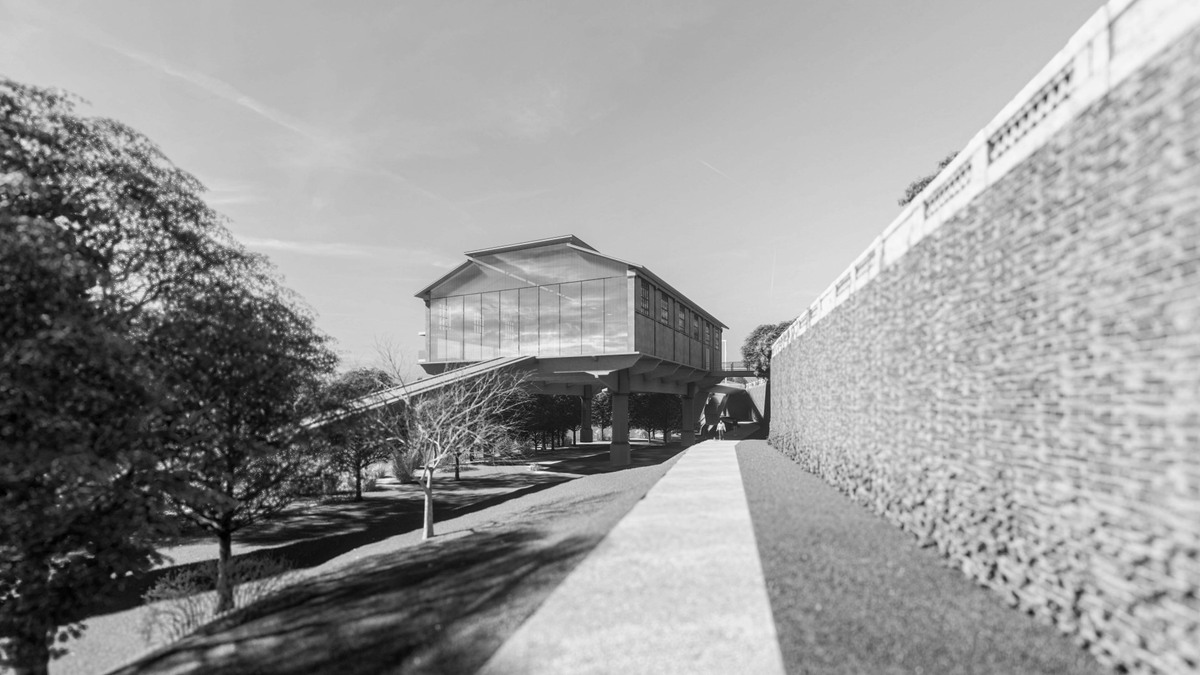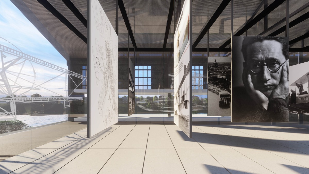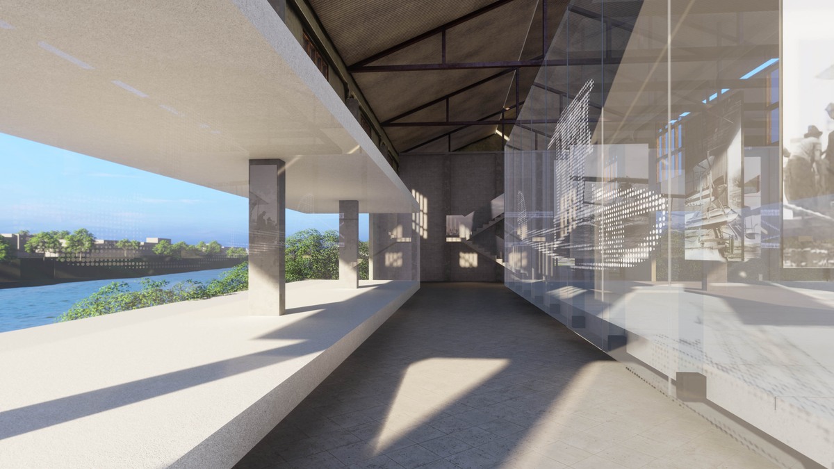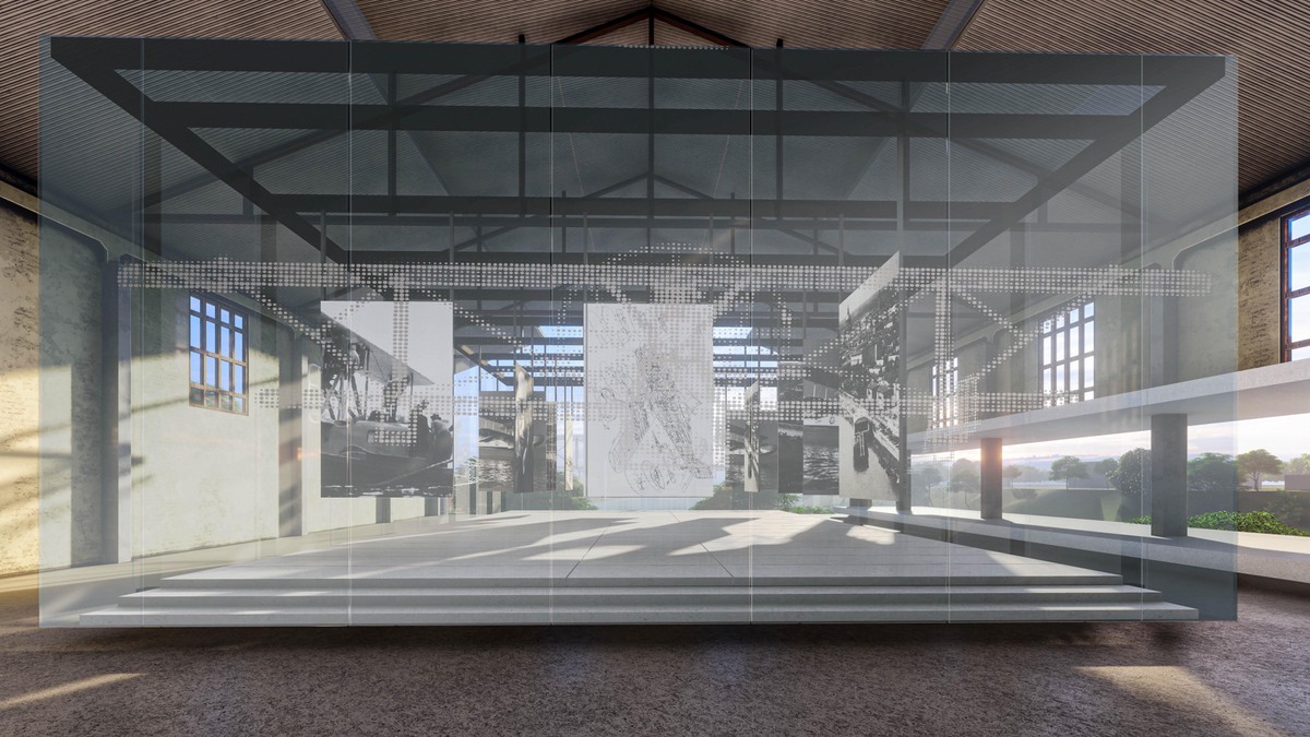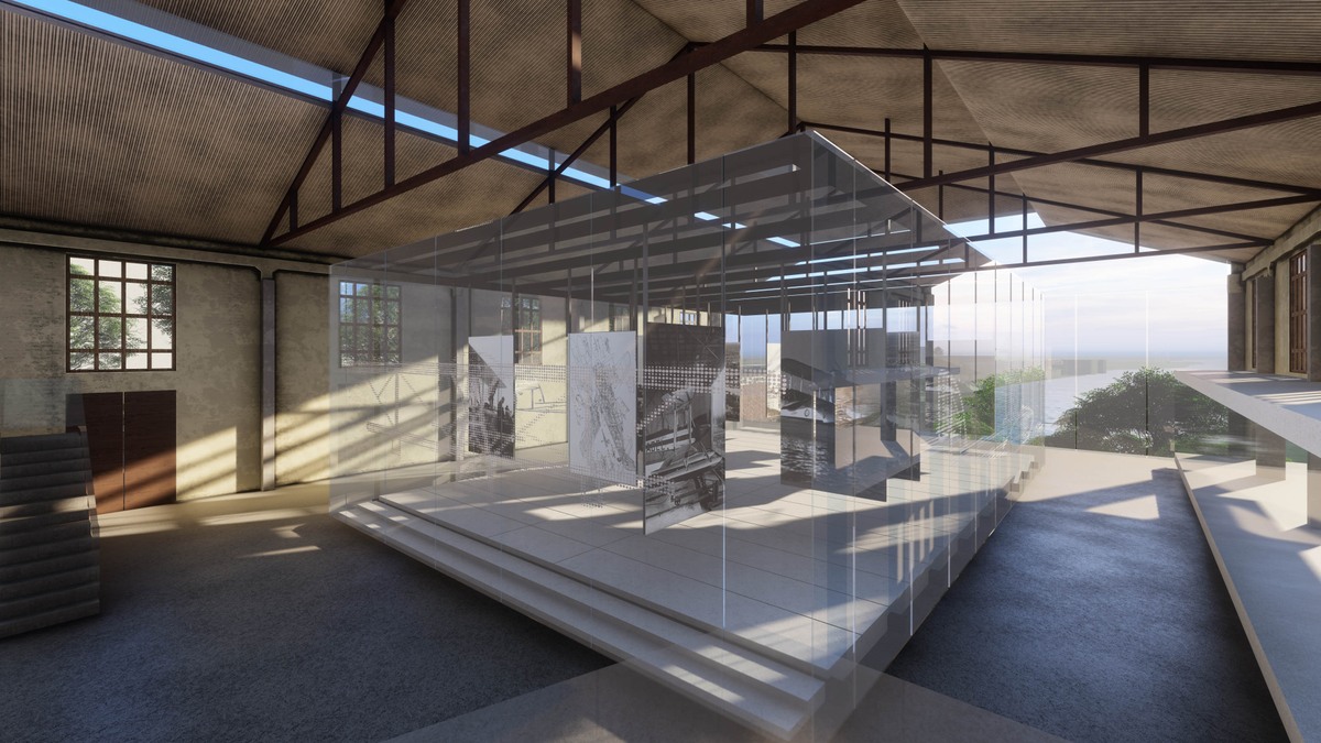 The Showcase (interior) :Inside of Idroscalo we propose an inverted showcase: Instead of displaying its inside, we construct a multi-function space from glass for people to look out into the historic building. Its floor is movable to fulfil the functional requirements.The East facade is turned into glass with views onto the river. A mechanism allows the floor of the showcase to move along the historic ramp to the outside.
