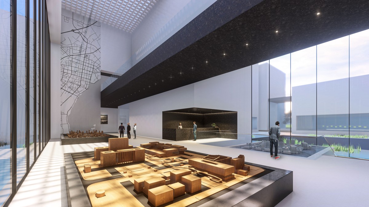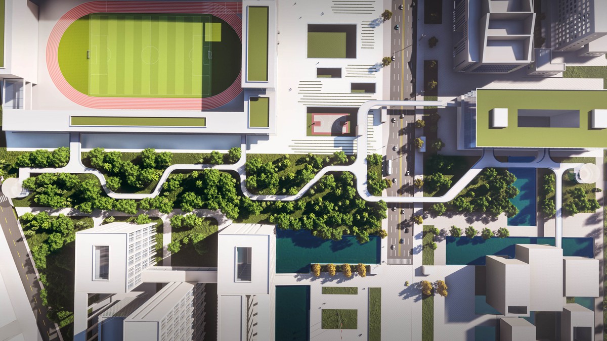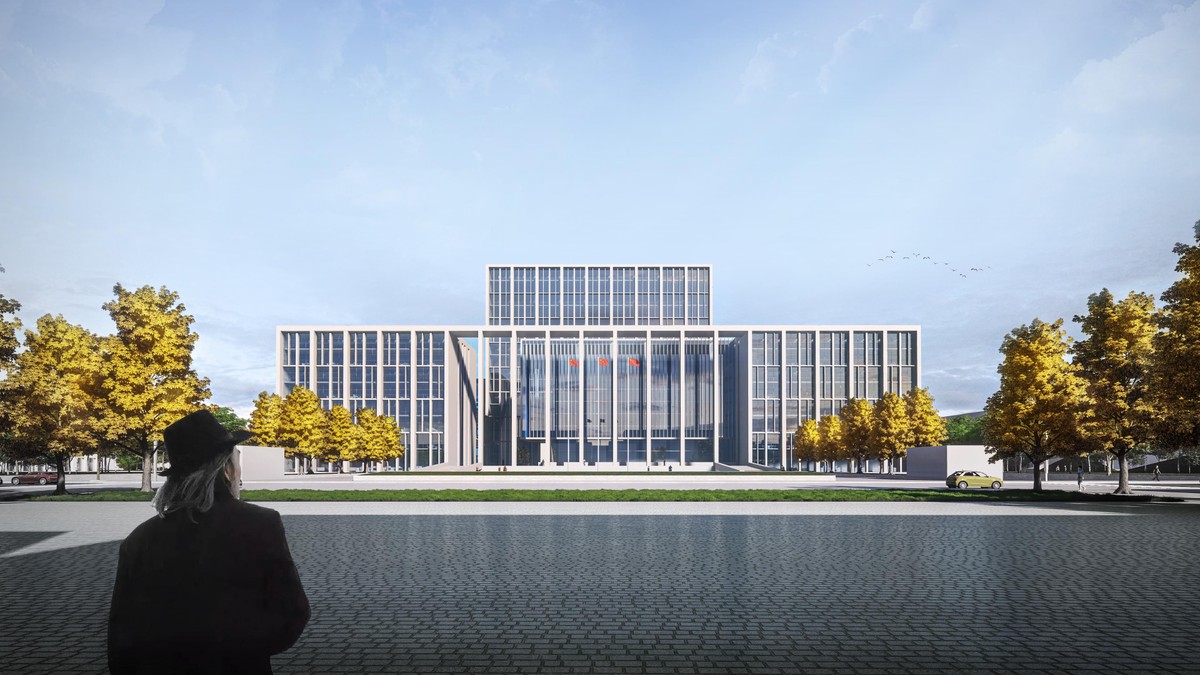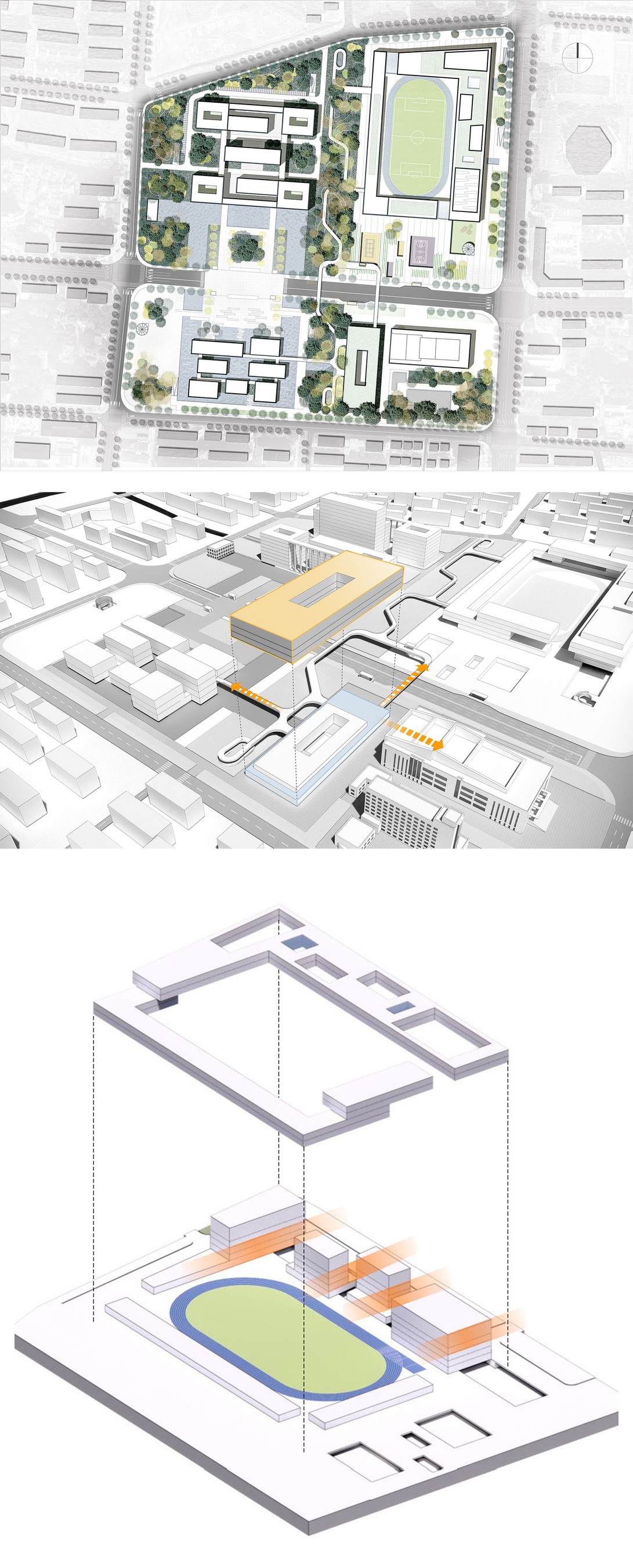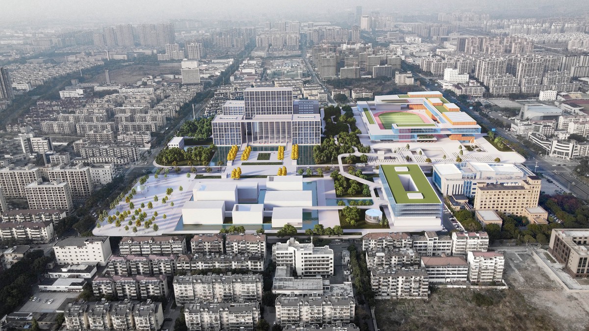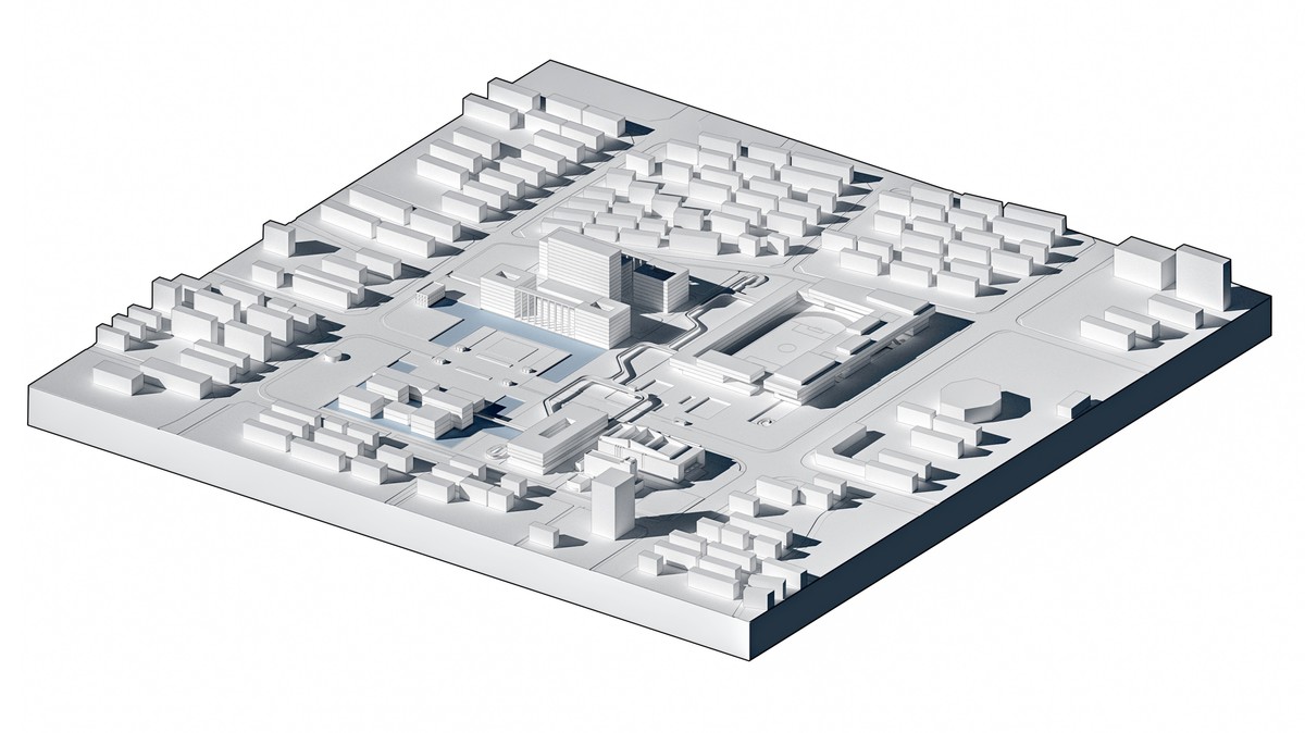 The design seeks to redefine the city center by incorporating squares, green spaces, and pedestrian bridges to organize various public buildings with distinct functions. The challenge lies in the constraints imposed by the existing built environment and the presence of multiple large public buildings with diverse functions, preventing the area from establishing a unified identity within the city.