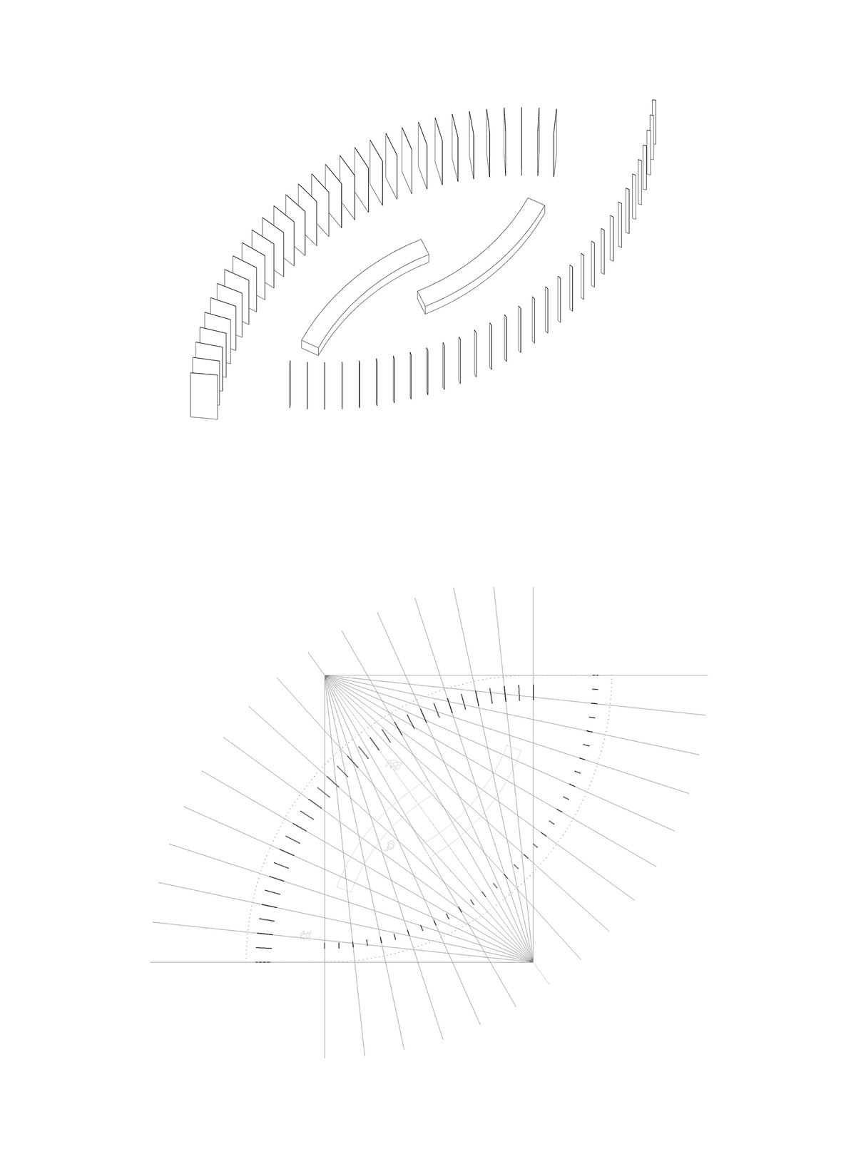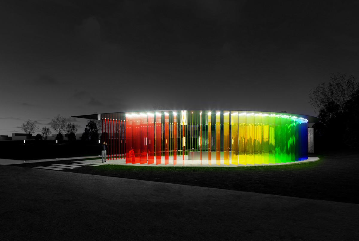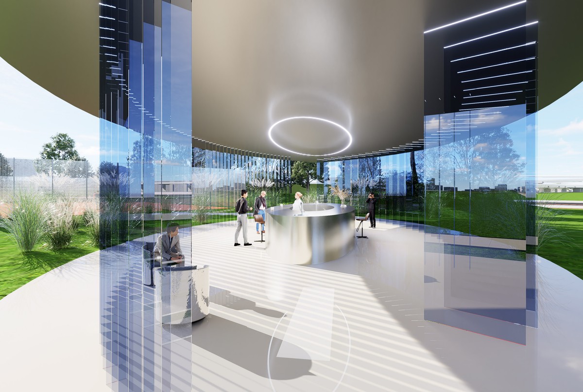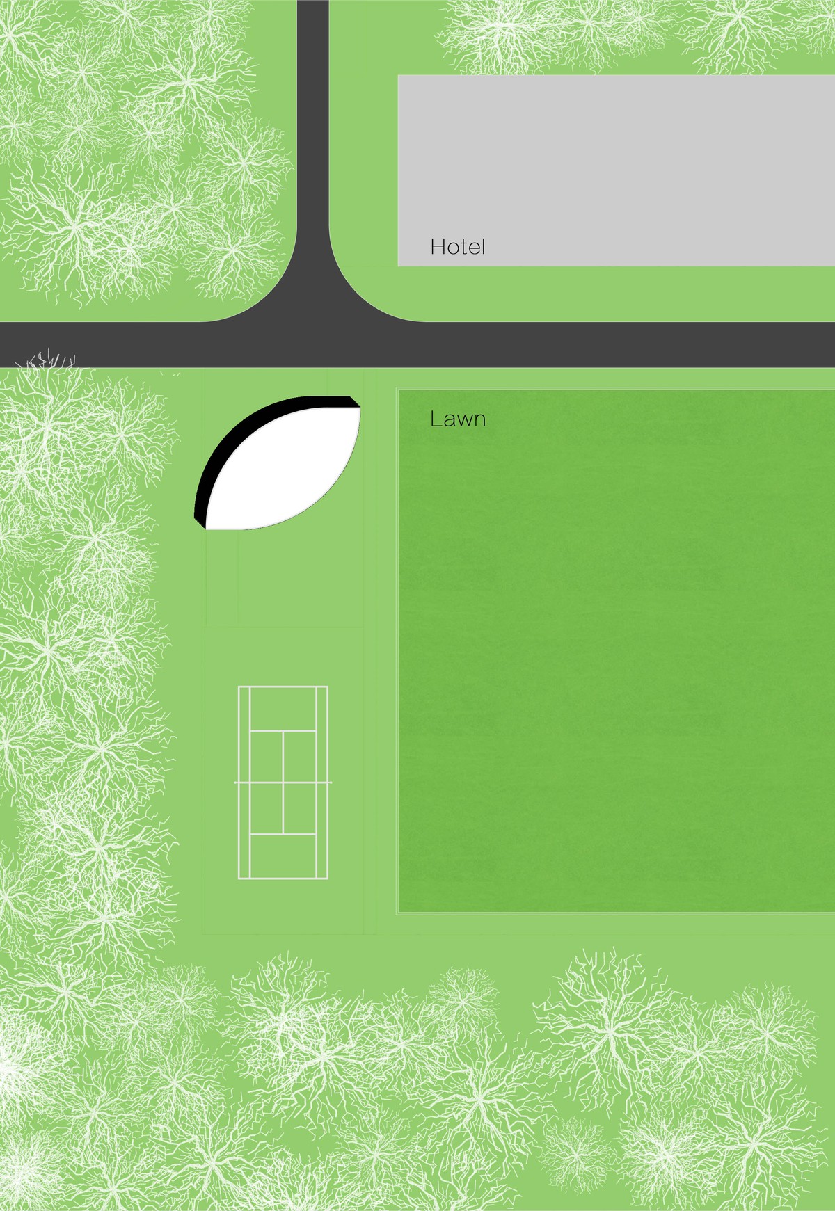 Harmonizing elements of flow and stillness, openness and shelter, the pavilion features two misaligned curved glass walls that encapsulate a space balancing fluidity and stasis, openness and protection. Positioned as a lounge between the hotel and the outdoor lawn, the pavilion transforms into a small bar during lawn events. The challenge of uncertain visitor numbers led to the decision to create a covered semi-outdoor space rather than an enclosed one, allowing flexibility.