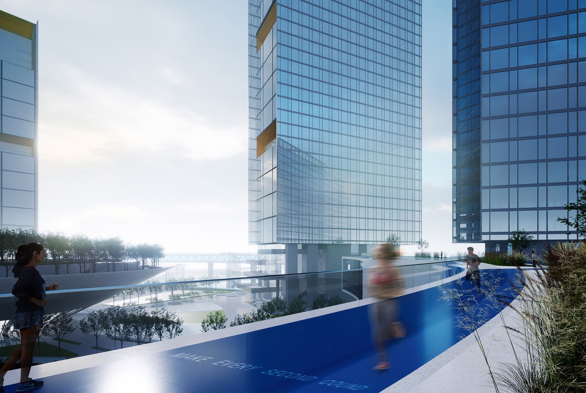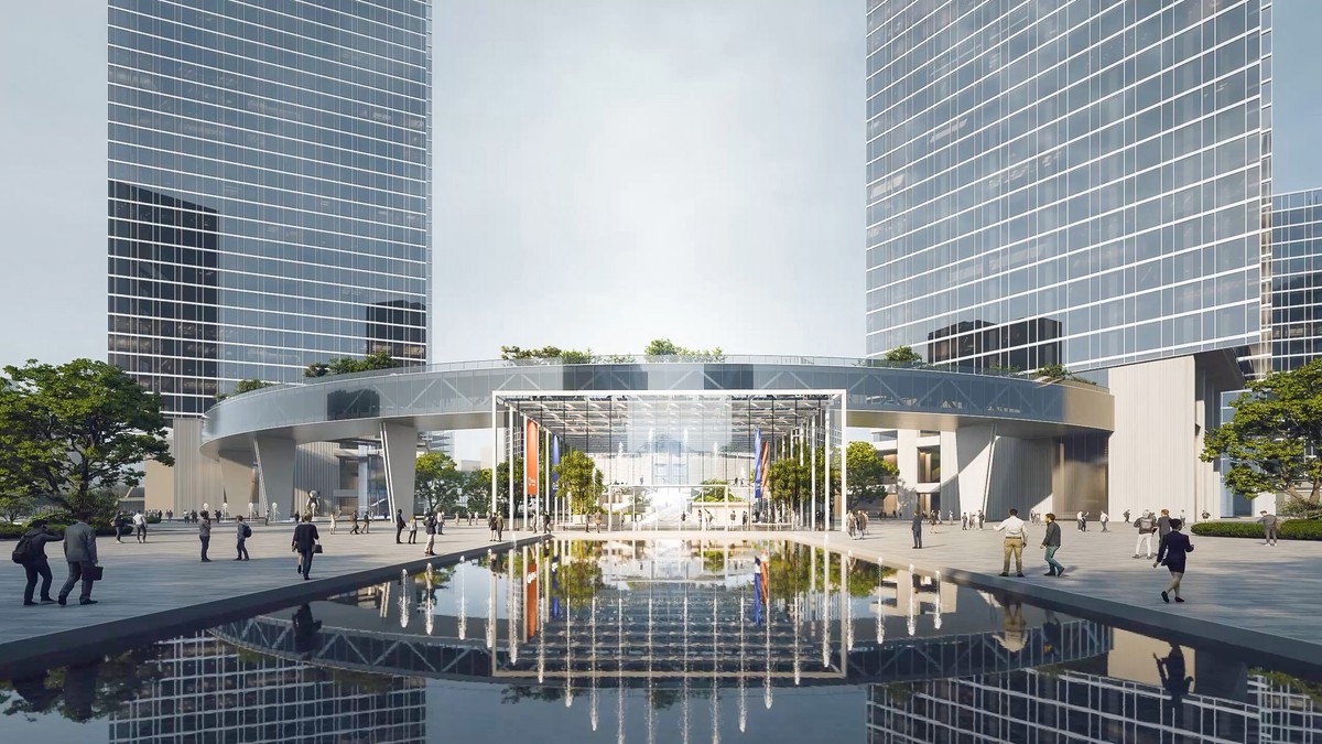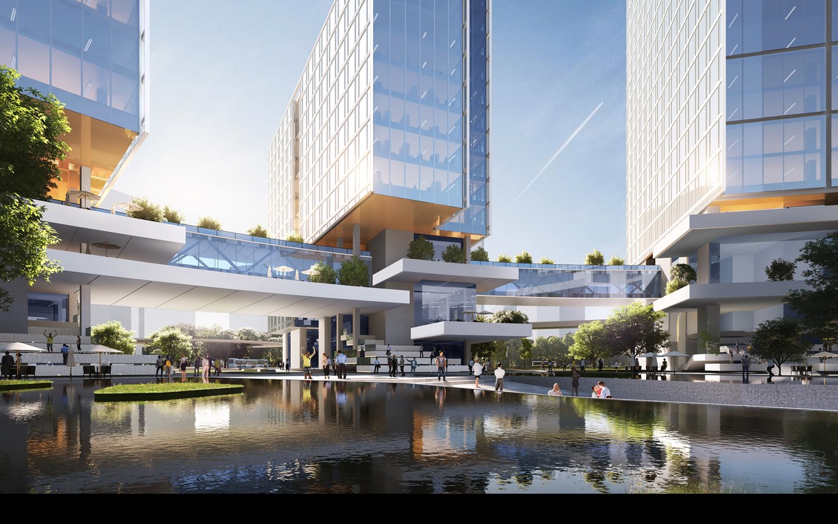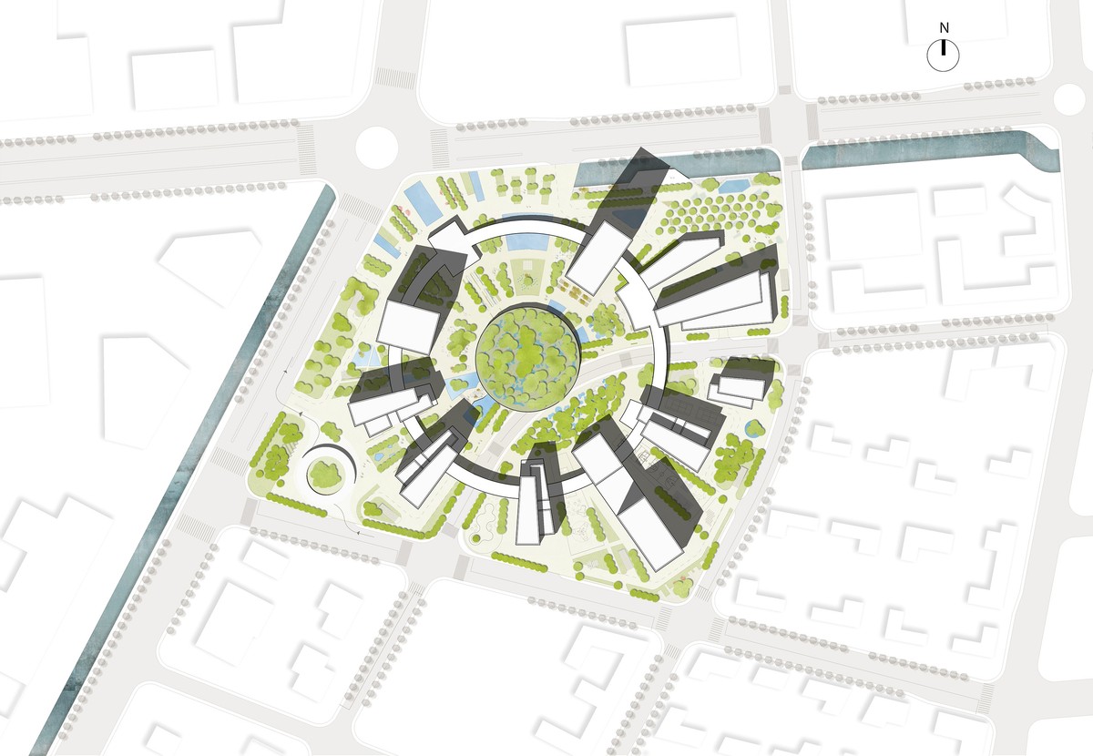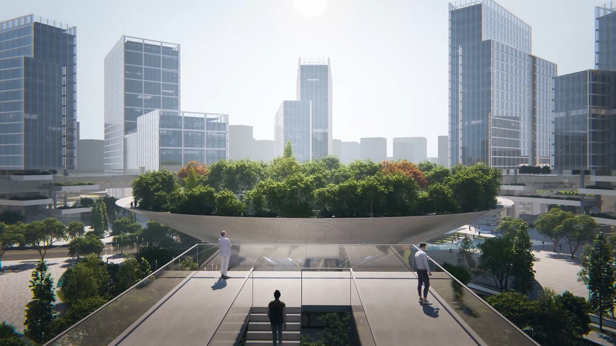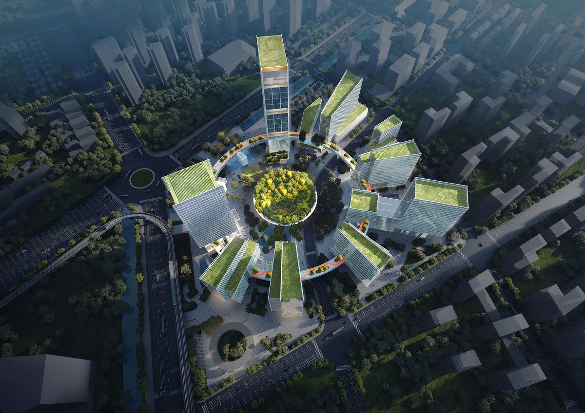 The podium section of the buildings houses essential urban services such as galleries, libraries, gyms, childcare facilities, etc., interconnected by a floating "ring." The upper tower has industrial functions mainly for offices. There is a conference hall in the center of the park.