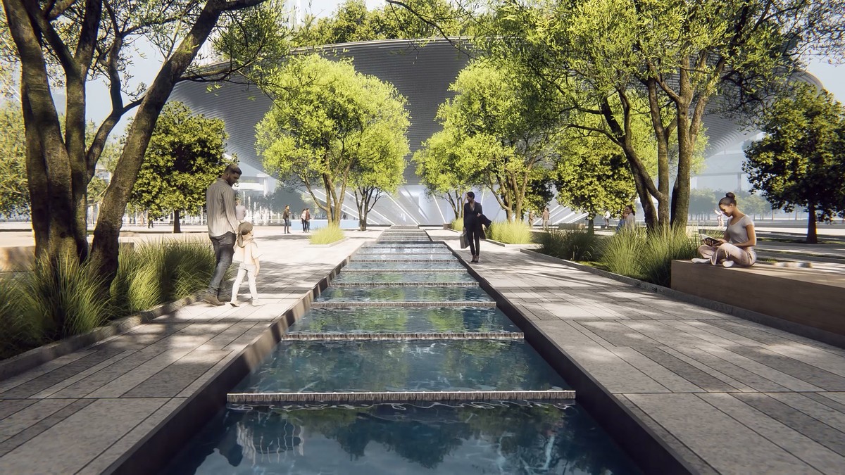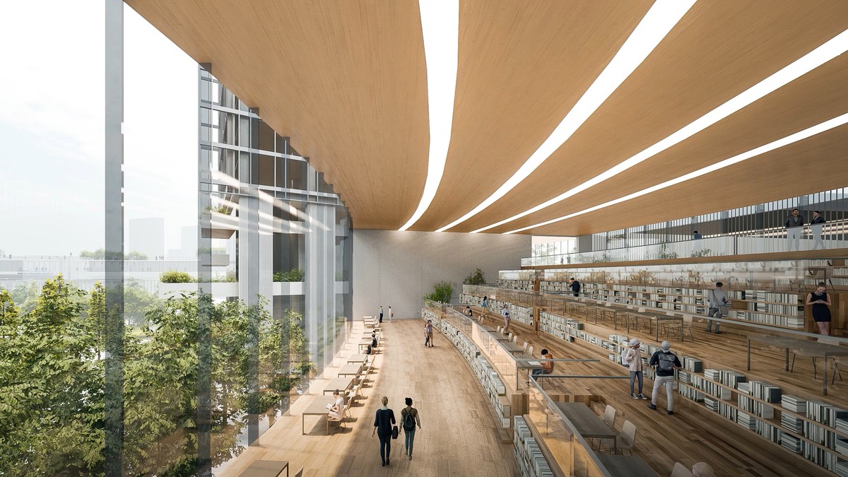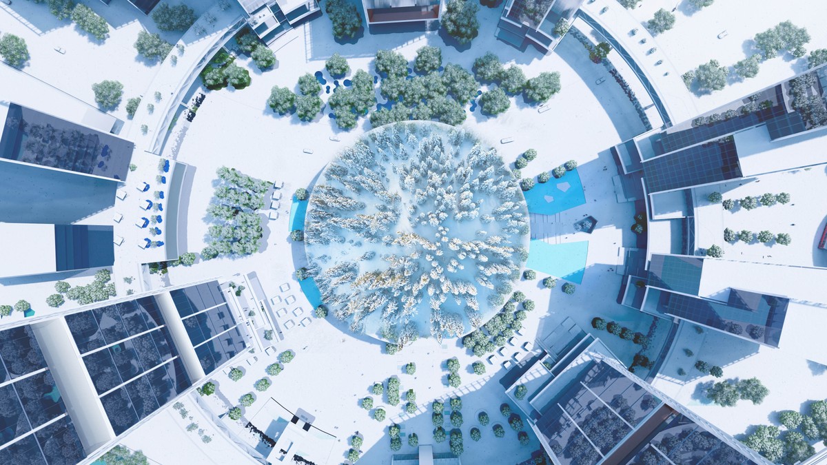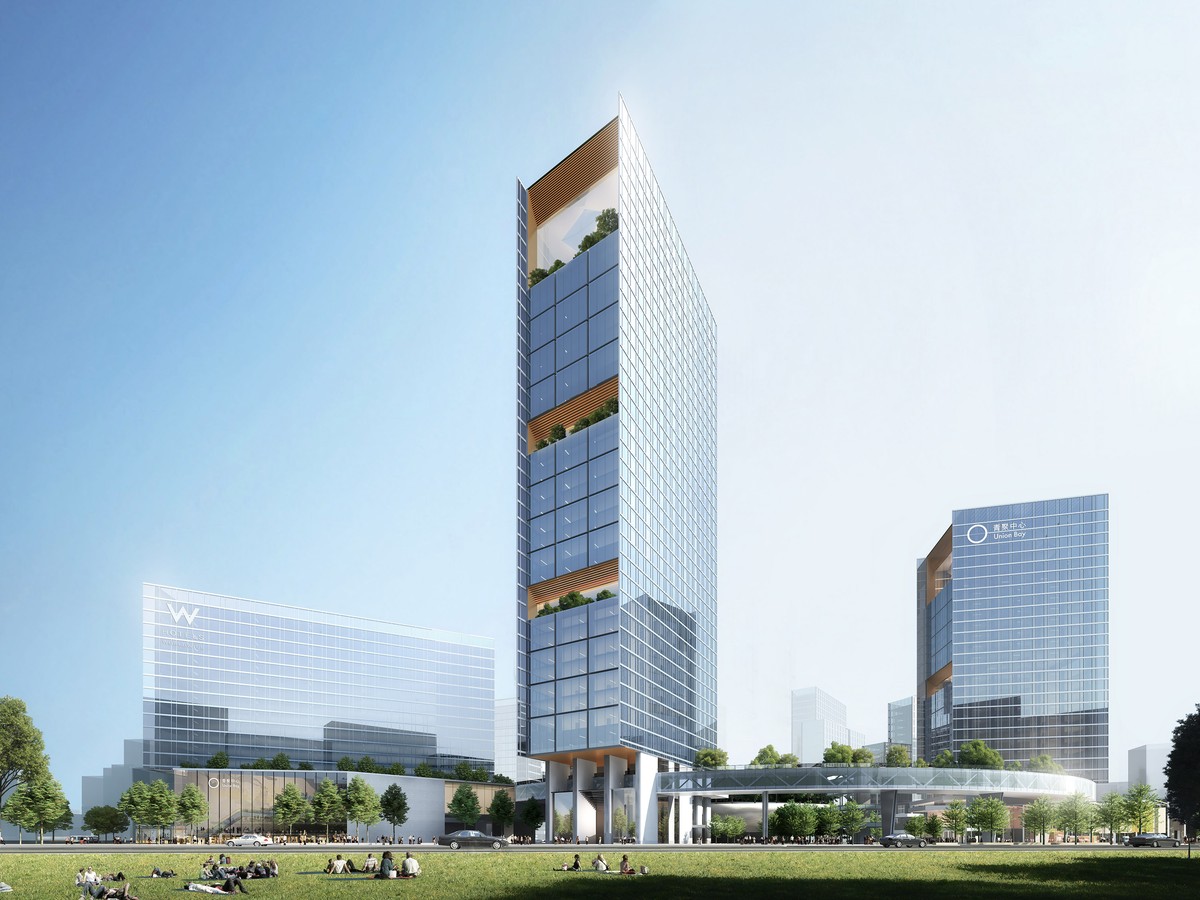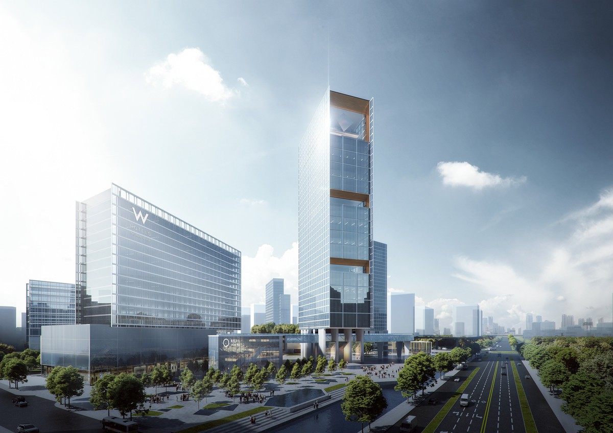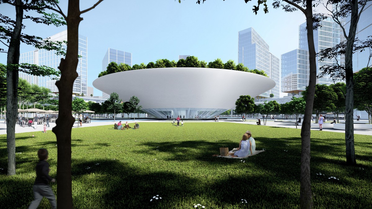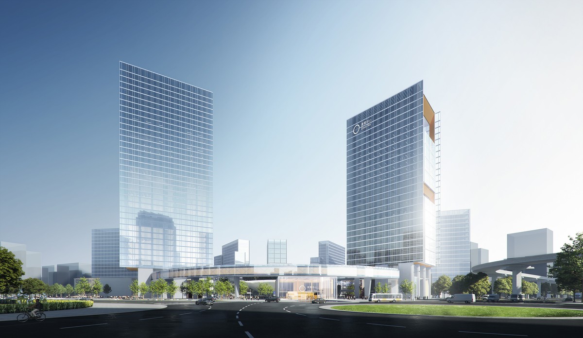 The podium section of the buildings houses essential urban services such as galleries, libraries, gyms, childcare facilities, etc., interconnected by a floating "ring." The upper tower has industrial functions mainly for offices. There is a conference hall in the center of the park.