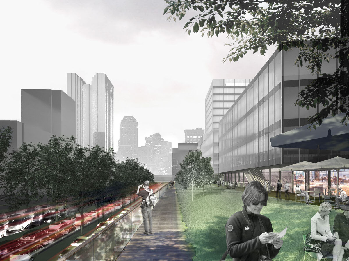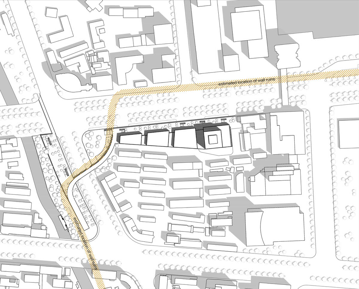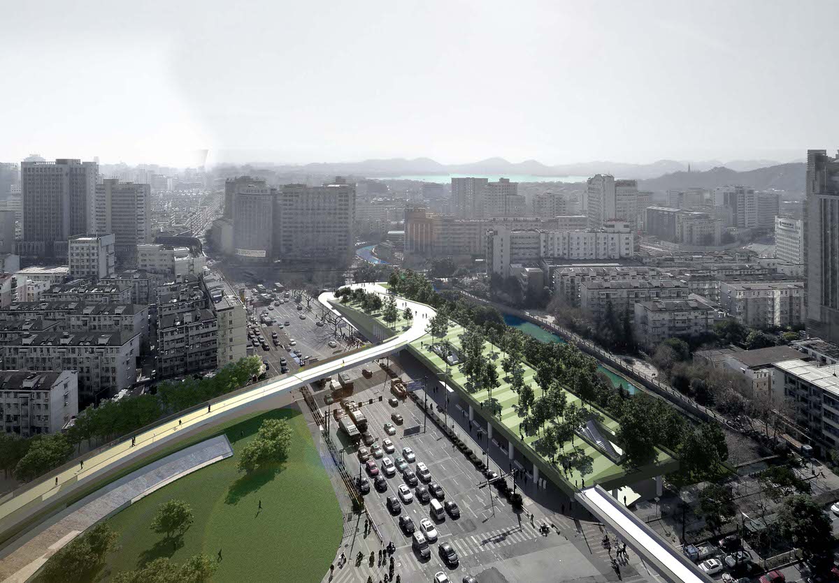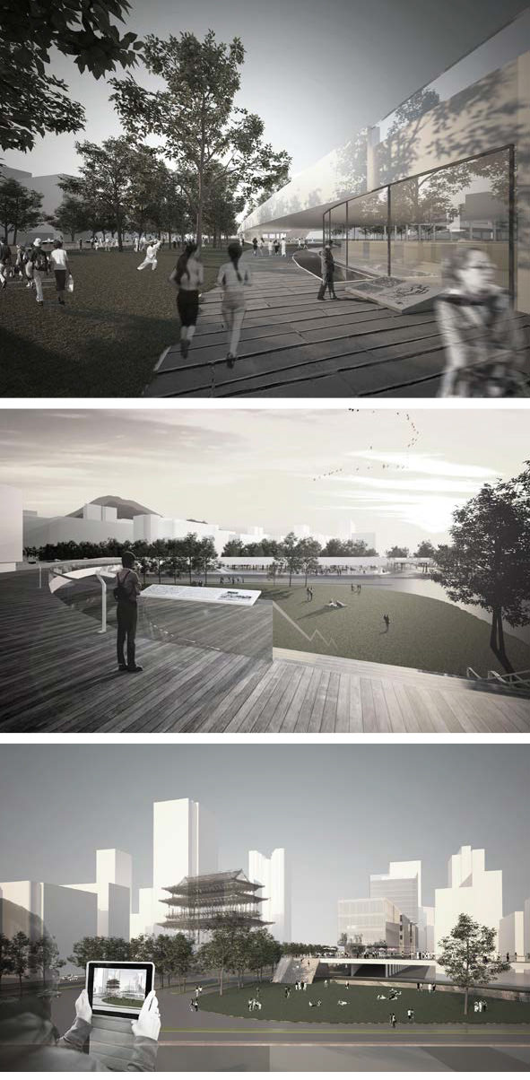 In the central commercial area, an old wholesale shoe market will be demolished shortly. The local government planned to redesign this area by adding bus terminals, public green land, commercial and office buildings. It is presumed by archeologists that the old city wall and its wall gates were buried under the northwestern side of this area. A pedestrian corridor, therefore, was planned along the longish site, linking the relics park, commercial district, bus terminals and office buildings. The scheme focused on using the land efficiently by a three-dimensional arrangement. Its integrated multi-functionality creates a diverse and lively urban space. A modern overpass is constructed along the ancient wall outline. Passengers could enjoy the charm of the ancient city wall by using techniques of augmented reality, which could be regarded as an attempt to use modern technology for historic preservation under given urban construction conditions.