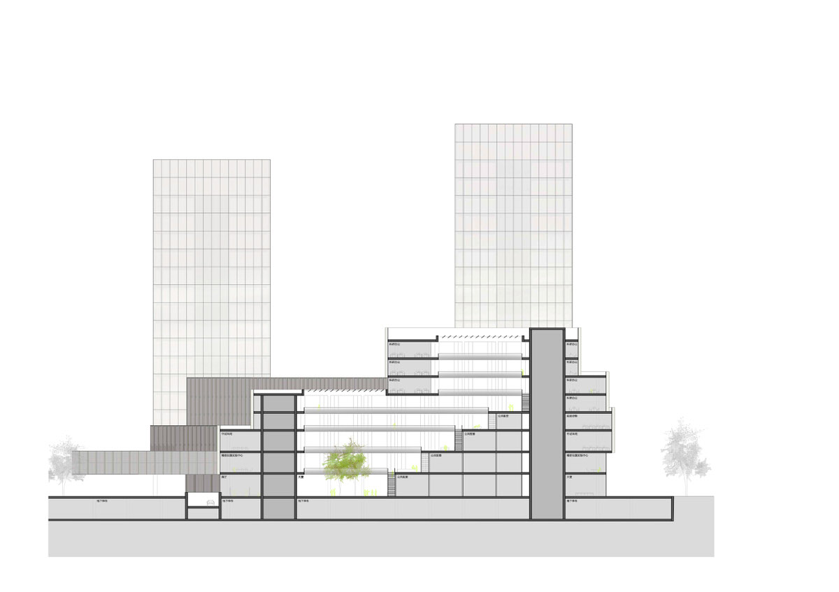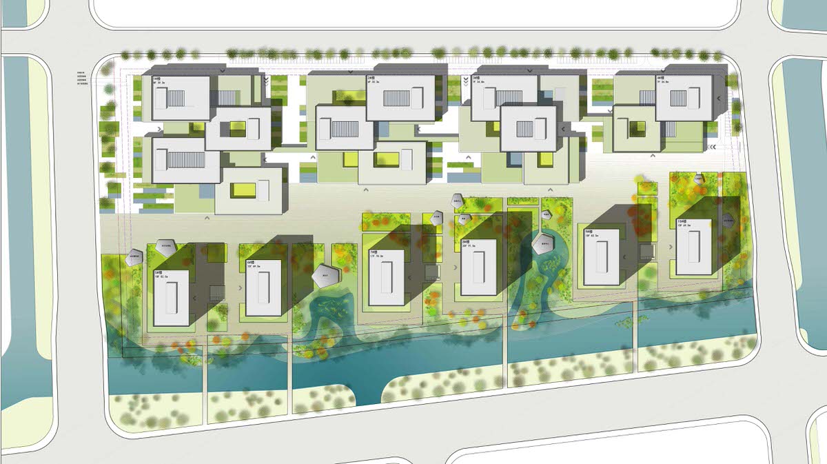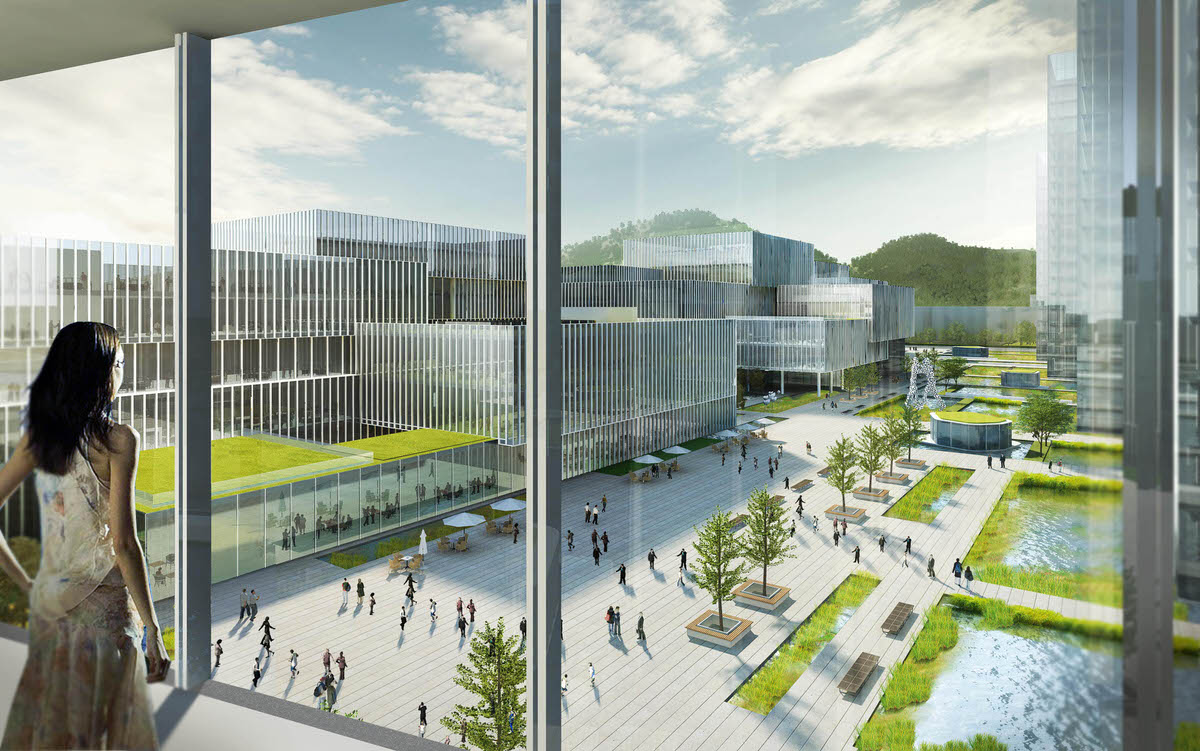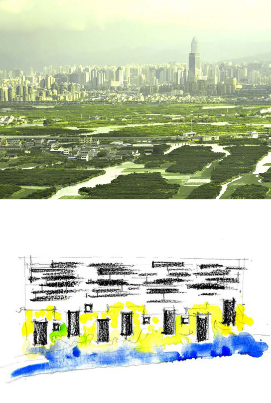 The fact that cities expand during the process of urbanization indicates that the ‘boundary’ of artificial and natural or between city and countryside is not fixed. The City of Wenzhou plans to expand towards Southeast, combining the urban area of Northwest with the airport of Southeast through Wenzhou Avenue. The site is located within an agricultural field with numerous small water channels – a typical landscape of southern Zhejiang Province. The design tried to integrate this first impression into the new technology parks rather than delete it. Using existing water channels, the design succeeded in introducing wetland landscape into the park, which looks like a building complex built within a wetland. At the same time, the water surface functions as a buffer zone between the park and the busy Wenzhou Avenue. Being landmark buildings, the southern towers along Wenzhou Avenue relate in scale and rhythm to its surroundings, creating a vivid nearby view, while the staggered design and development building on North draw an undulating skyline in the middle, together with high-rise office buildings forming an East-West pedestrian zone whose scale is more human-orientated and comfortable. The elegant outline of distant Huangshi Mountain is the natural skyline of the city.